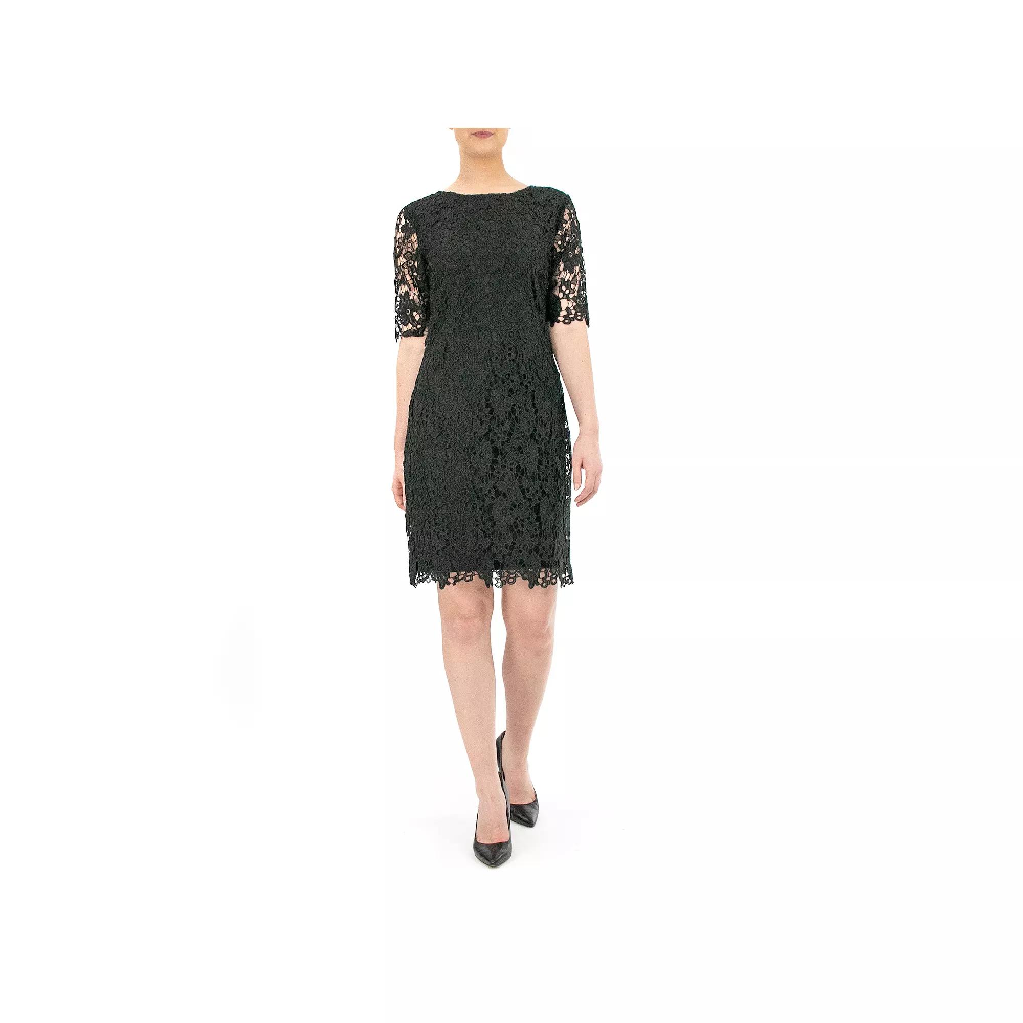 This womens lace cocktail dress from Nina Leonard is perfect for any special occasion. This womens lace cocktail dress from Nina Leonard is perfect for any special occasion.Finding the perfect fit and size for womens clothing requires basic measurements of your chest, waist, hips and inseam. Use this guide to learn more about sizing and everything Kohls has to offer in womens fashion. Scoopneck Elbow sleeves Scalloped hem Lace construction UnlinedFIT & SIZING 38 1/2-in. approximate length from shoulder to hem Sheath cut Back zipper closureFABRIC & CARE Polyester Machine wash - Delicate Imported Size: Large. Color: Black. Gender: female. Age Group: adult. Pattern: Solid.