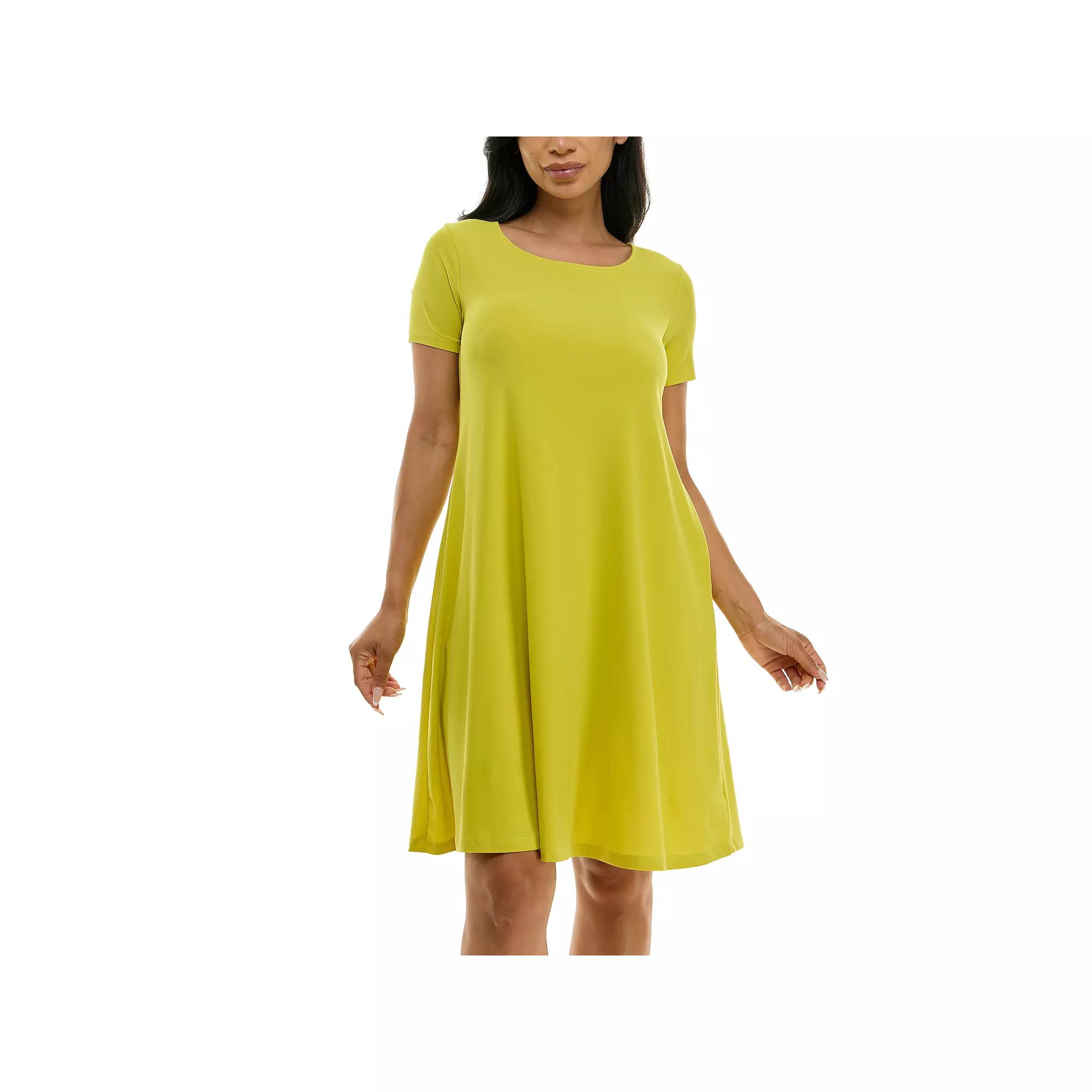 A lace-up back detail adds stylish intrigue to this womens Nina Leonard trapeze dress. Plus, it has pockets! Lace-up back detail Scoopneck Short sleeves 2 pockets Jersey construction UnlinedFIT & SIZING 39-in. approximate length from shoulder to hem Trapeze cutFABRIC & CARE Polyester, spandex Machine wash - Delicate Imported Size: Small. Color: Green. Gender: female. Age Group: adult.