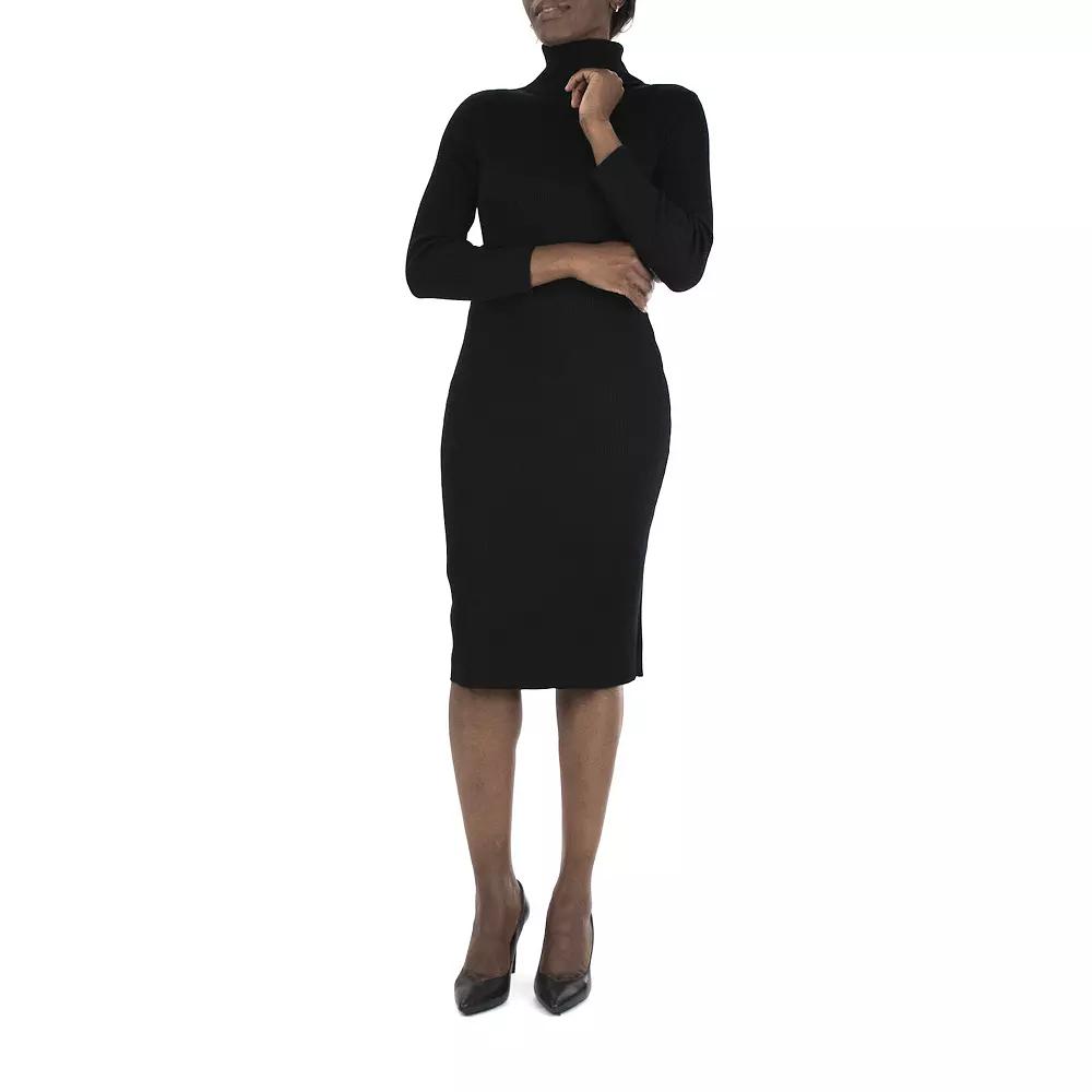 A figure-flattering cut and cozy knit construction makes this womens Nina Leonard sweater dress a charming choice. A figure-flattering cut and cozy knit construction makes this womens Nina Leonard sweater dress a charming choice. Turtleneck Long sleeves Ribbed trim Soft knit construction UnlinedFIT & SIZING 42-in. approximate length from shoulder to hem Sheath cut Pull-on designFABRIC & CARE Rayon, polyester Machine wash - Delicate Imported Size: Large. Color: Black. Gender: female. Age Group: adult. Pattern: Solid.