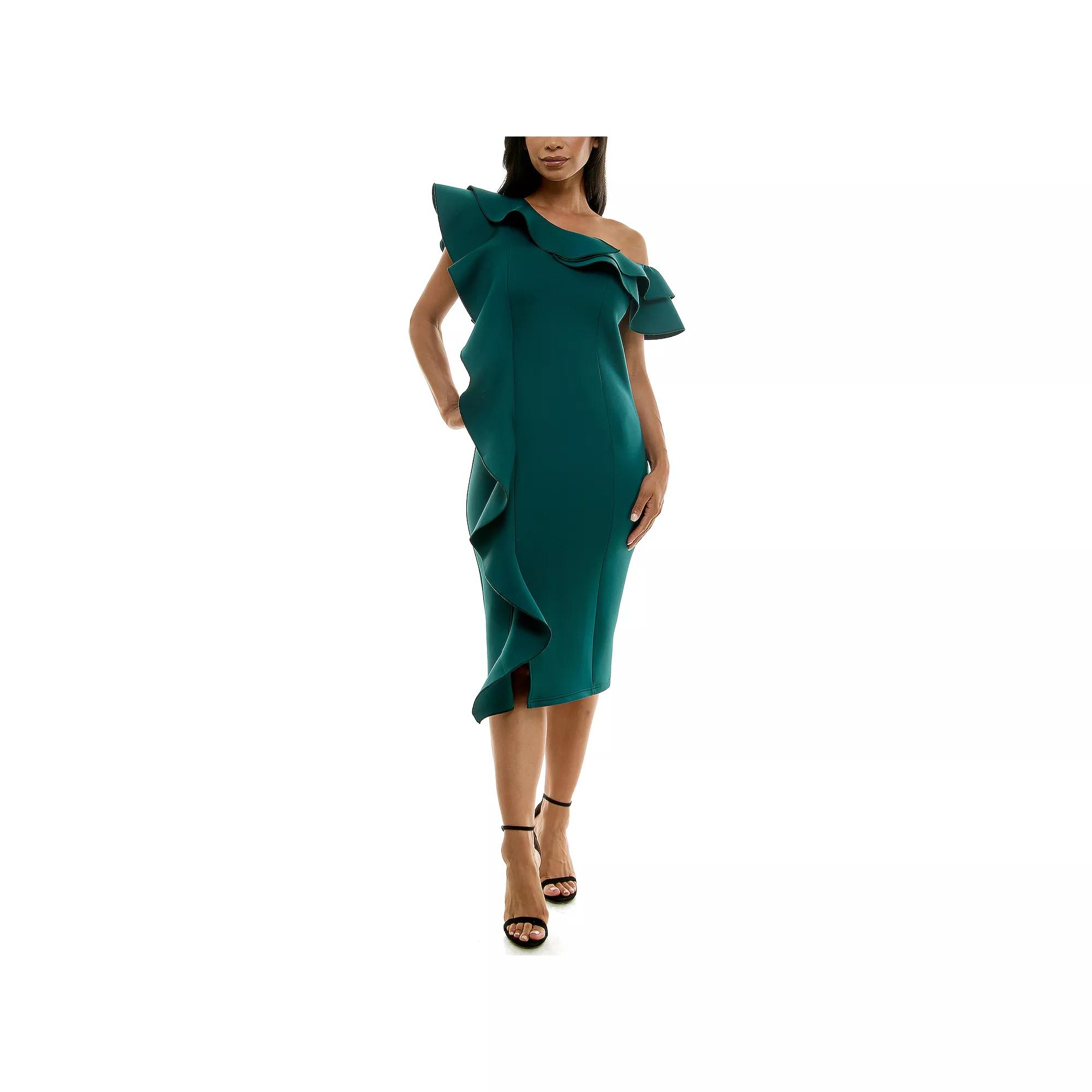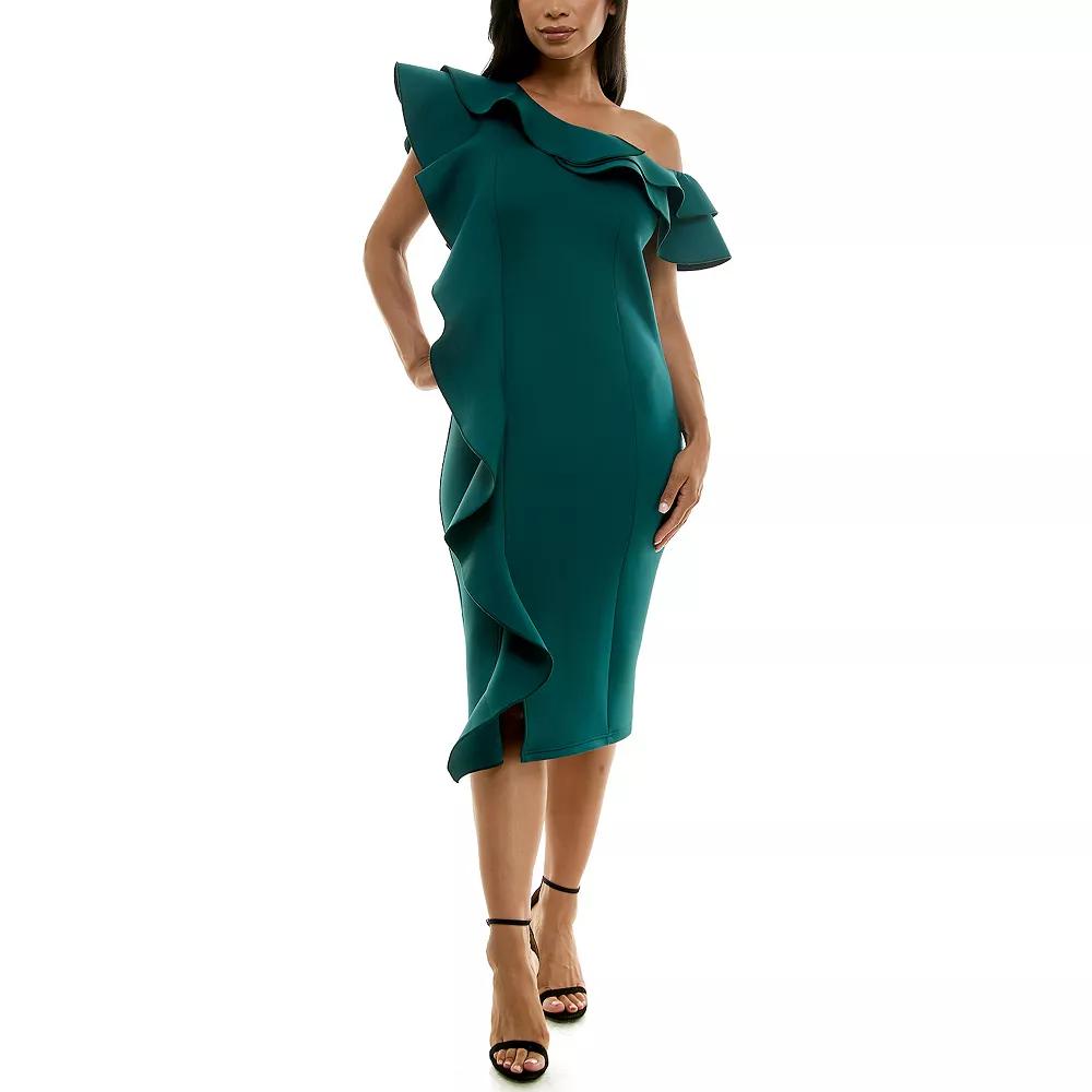 Make an impression in this boldly stylish womens Off-The-Shoulder Ruffle Dress from Nina Leonard.Click on this WOMENS GUIDE to find the perfect fit and more! Make an impression in this boldly stylish womens Off-The-Shoulder Ruffle Dress from Nina Leonard.Click on this WOMENS GUIDE to find the perfect fit and more! FEATURES Sheath silhouette Asymmetrical neckline Zipper closure Sleeveless UnlinedFIT & SIZING 43-in. length from shoulder to hem Midi length hits below the kneeFABRIC & CARE Polyester, spandex Machine wash Imported Size: Small. Color: Emerald. Gender: female. Age Group: adult.