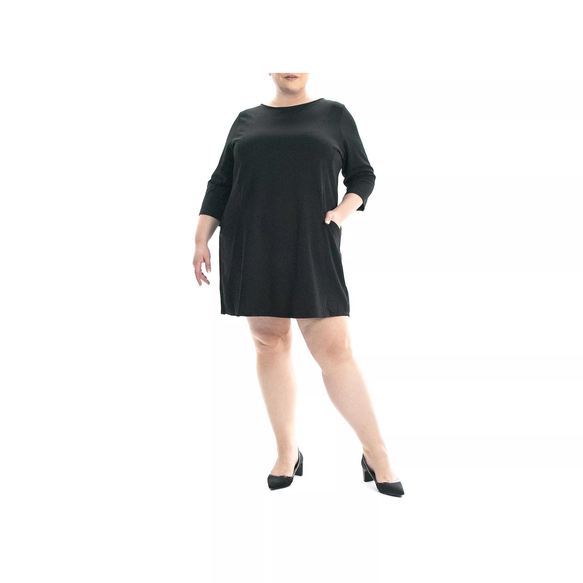 Feel comfy, yet look ultra-elegant in the pretty jewel neck 3/4 sleeve high tech dress. . Scoop neck. 3/4 sleeves. Back zip closure. Slip on over head. Two front pockets. Knit construction. Solid color. Approx. 36 length (size 2X). Imported This item cannot be shipped to Canada. Machine wash cold 95% polyester, 5% spandex