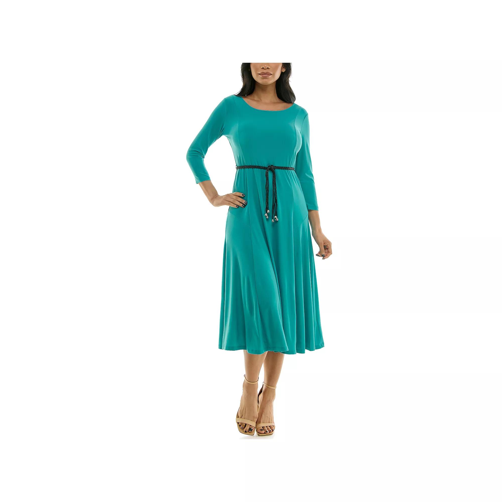 The stylish women's Sylvia three-quarter sleeve belted midi dress from Nina Leonard is sure to become a fashion staple in your wardrobe.Click on this WOMEN'S GUIDE to find the perfect fit and more!The stylish women's Sylvia three-quarter sleeve belted midi dress from Nina Leonard is sure to become a fashion staple in your wardrobe.Click on this WOMEN'S GUIDE to find the perfect fit and more!FEATURES A-line silhouette No closure - pullover styling Scoopneck 3/4-length sleeves Coordinating sash Soft and cool construction UnlinedFIT & SIZING True to size 46-in. length from shoulder to hem Midi length hits below the kneeFABRIC & CARE Polyester, spandex Machine wash Imported Size: X Large. Color: Peacock. Gender: female. Age Group: adult.