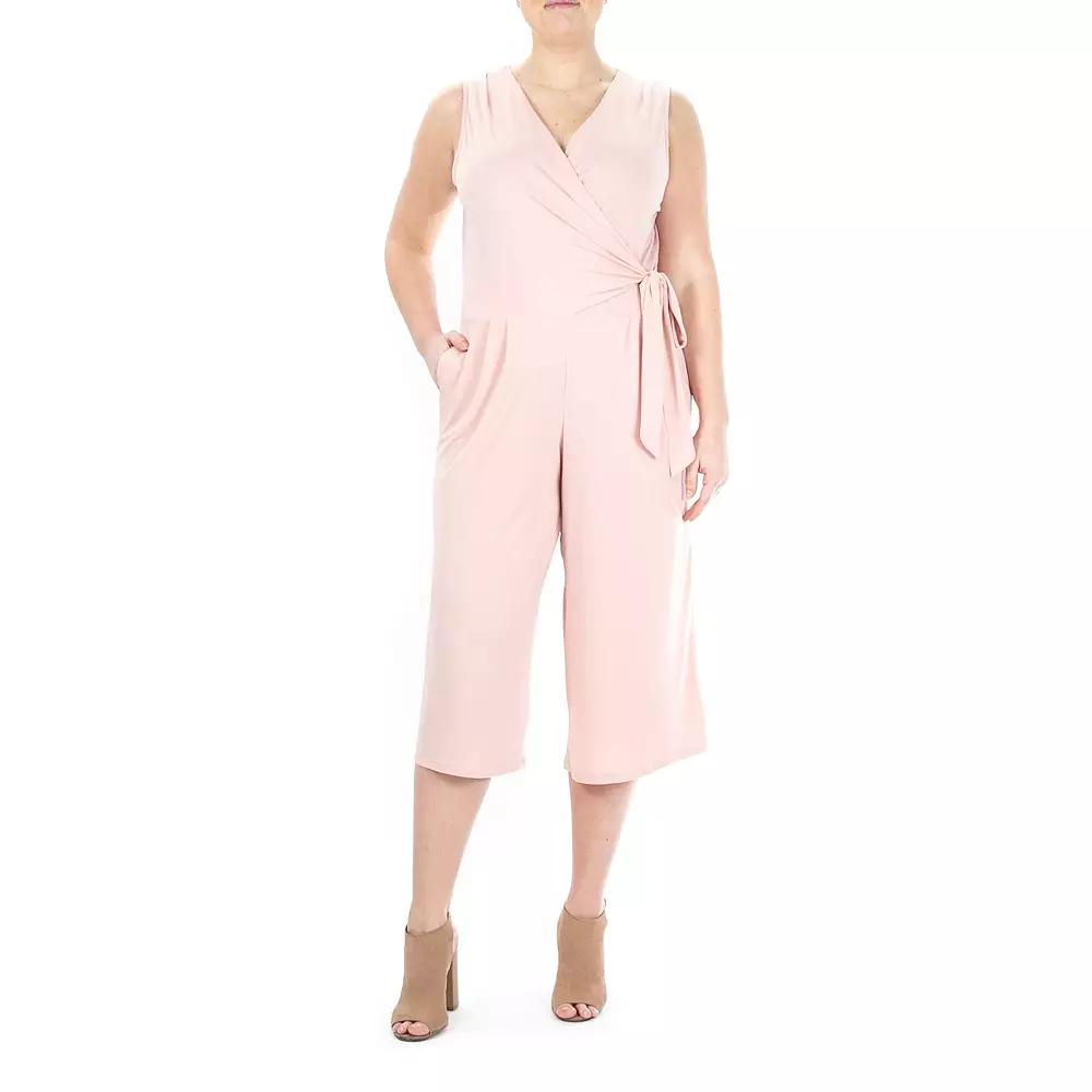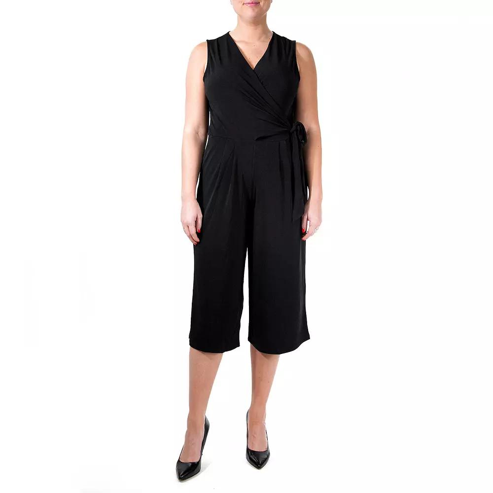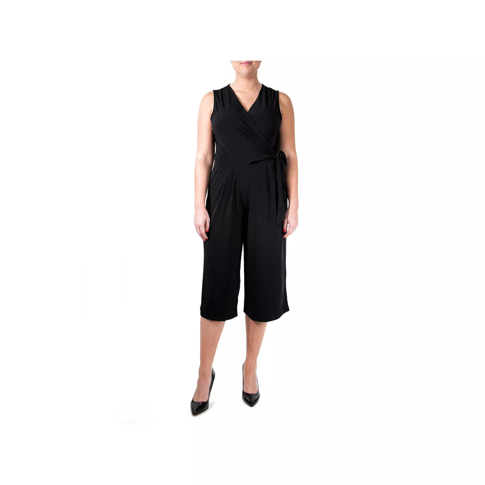 A cropped leg jumpsuit is finished off with a wrap tie waist for a minimalistic and elegant ensemble. - Surplice neck- Sleeveless- Self-tie at waist- Side slash pockets- Stretch knit construction- Wide leg- Cropped- Approx. 49 length, 22 inseam (size M)- ImportedAvailable in:- Solid color (BLACK)- Anchor print (NAVY) Models stats for sizing:. Height: 510. Bust: 34. Waist: 24. Hips: 34 Model is wearing size S. Machine wash 95% polyester, 5% spandex