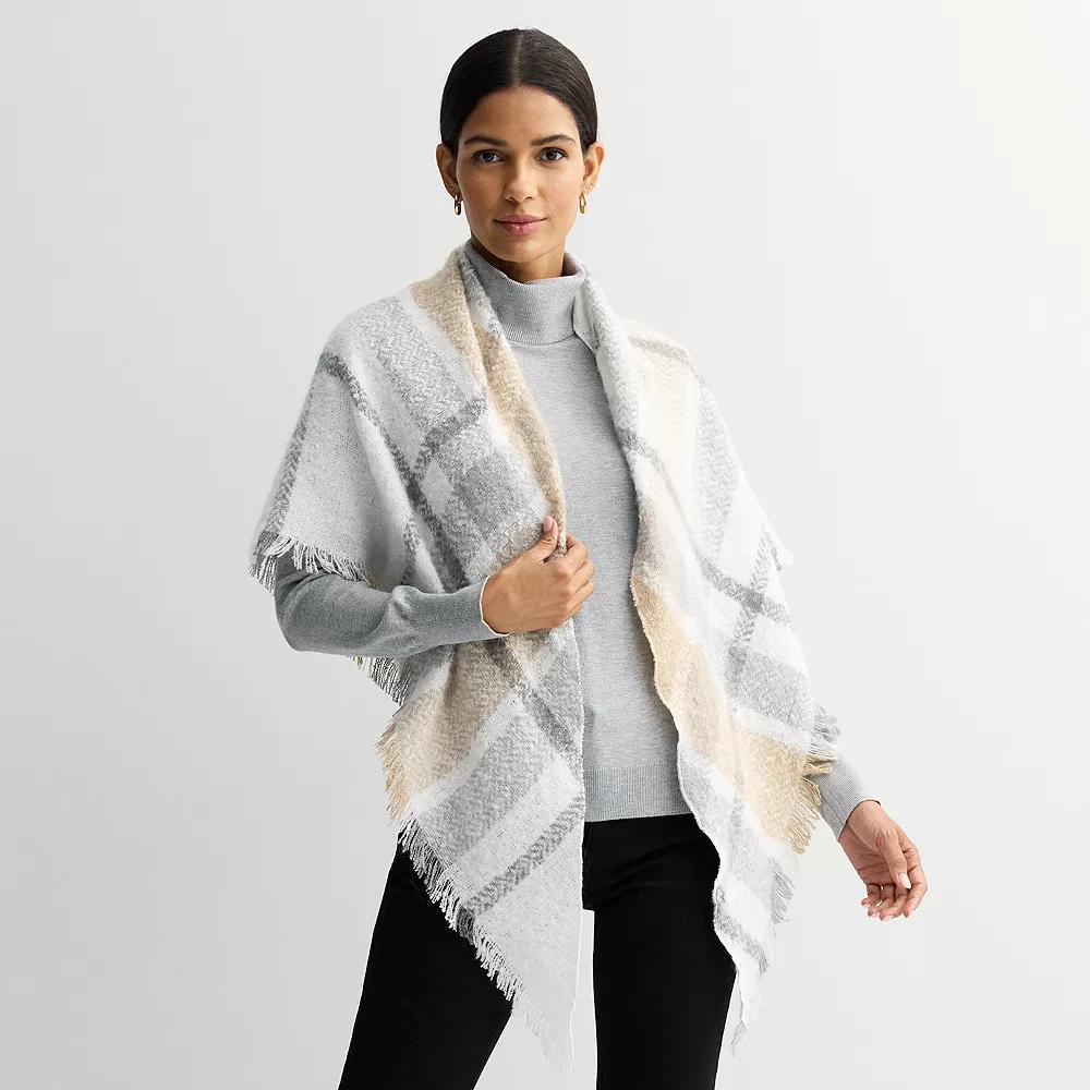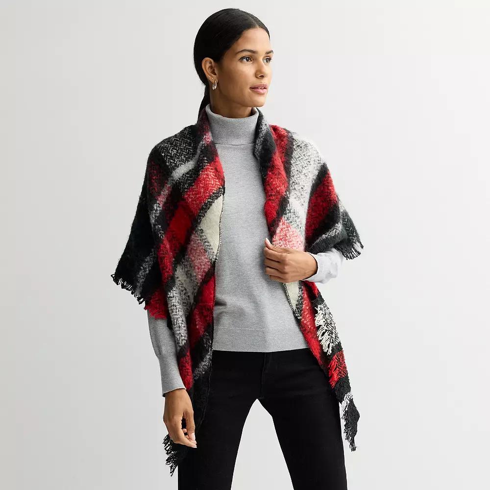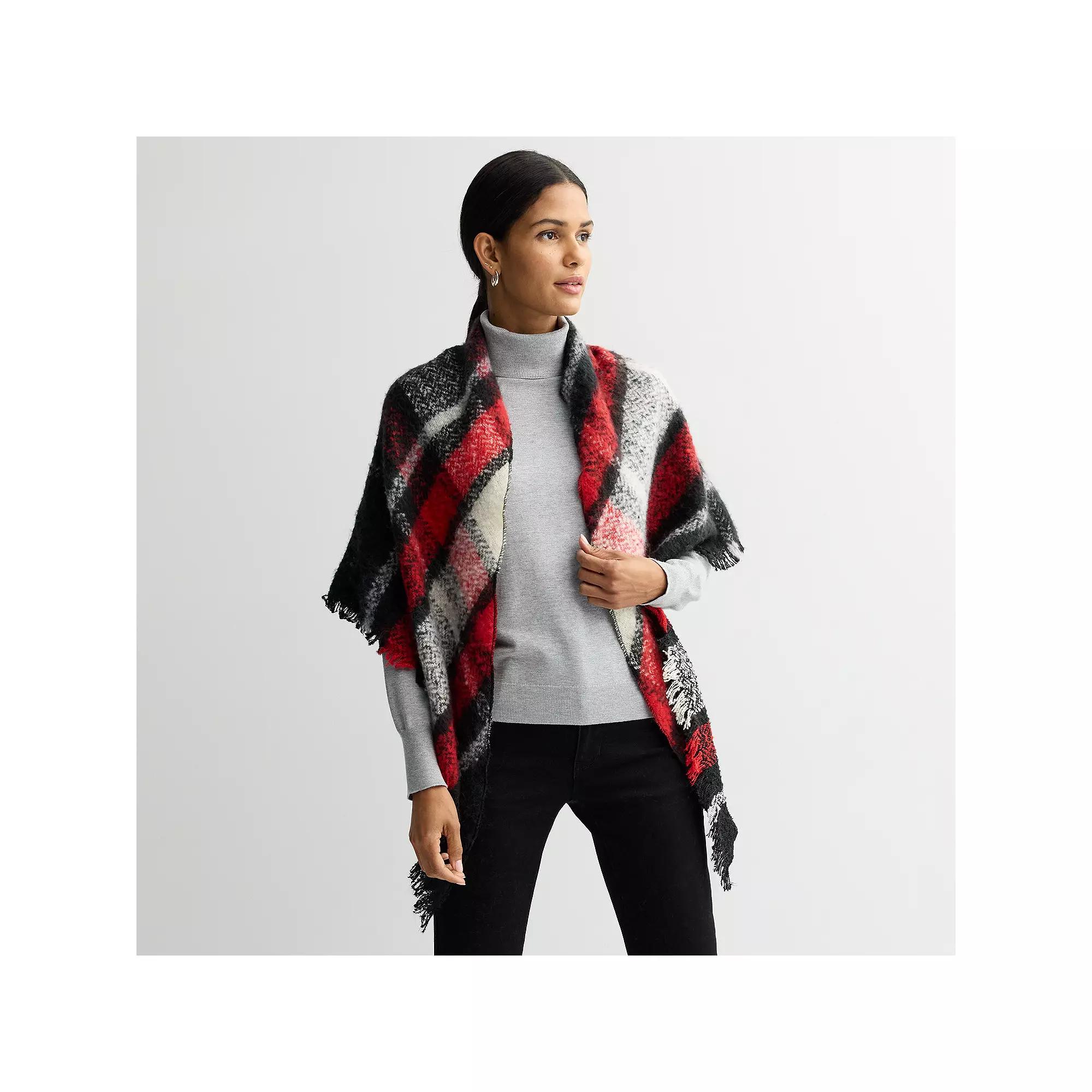 Wrap yourself in the timeless charm of this stunning plaid triangle scarf from Nine West, effortlessly blending warmth and style. Its generous size makes it perfect for layering over your favorite outfits, adding a chic yet cozy touch to any wardrobe, whether you're heading to a cozy cafe or a weekend adventure. How do you accessorize? Check out our ACCESSORIES GUIDE for essential tips to elevate your style with must-have accessories. - https://www.kohls.com/feature/accessories-guide.jsp. FEATURES: Open front design for easy layering, Gorgeous pattern and fringe along bottom edge for extra style. FIT & SIZE: 48"W x 68”L, One size fits most. DETAILS: Lightweight, Imported. MATERIAL & CARE: Polyester, Hand wash. Color: Black Red. Gender: female. Age Group: adult.
