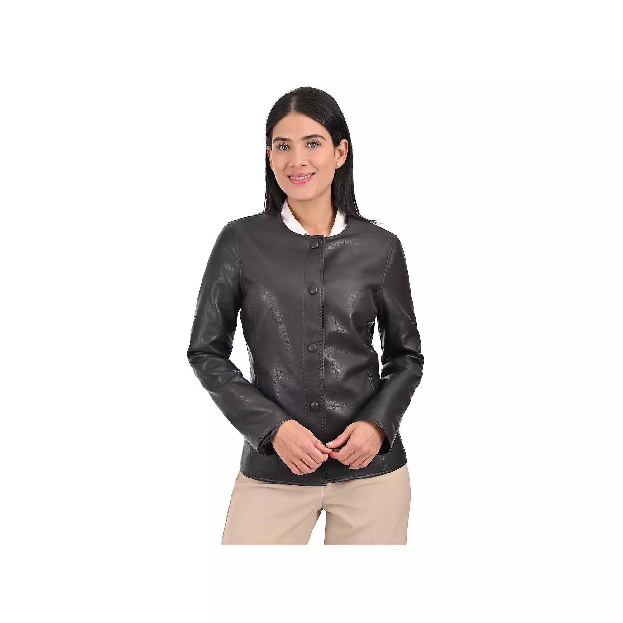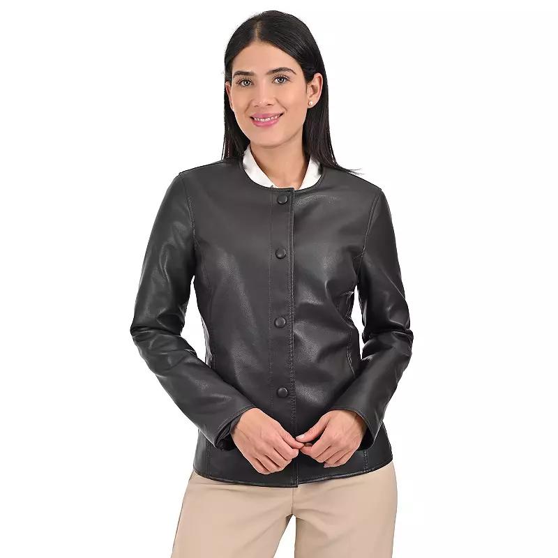 Add an elevated element to your style with this womens Nine West no collar jacket.Click on this WOMENS GUIDE to find the perfect fit and more! Add an elevated element to your style with this womens Nine West no collar jacket.Click on this WOMENS GUIDE to find the perfect fit and more! FEATURES Faux leather jacket without a collar for a clean and dressier look Features covered metal snaps in the same fabric as the body of the jacket Slightly longer body to ensure a more comfortable and flattering fit Two side entry pockets at the waist and one interior pocket Snap closure Long sleeves Fully linedFIT & SIZING Regular fit 24 1/2-in. length from shoulder to hem Designed to hit just below the waist MidweightFABRIC & CARE Polyurethane, polyester Dry clean Imported Size: X Large. Color: Dark Brown. Gender: female. Age Group: adult.