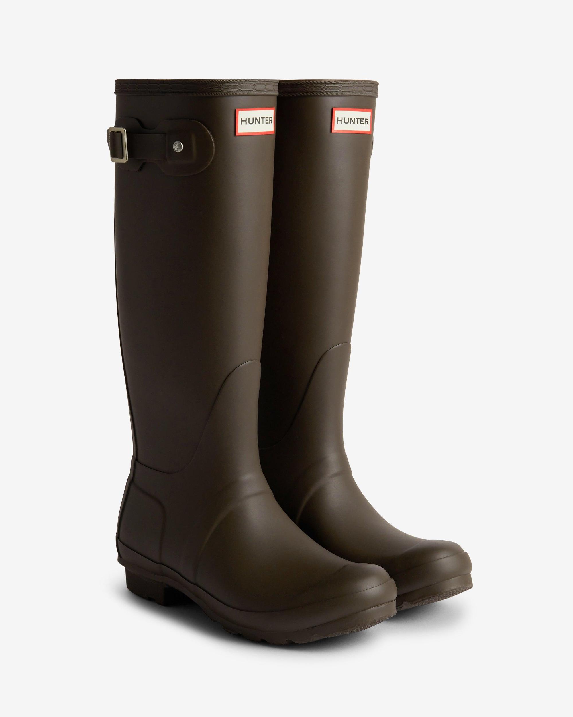 Women's Original Tall Wellington Boots Size/Fit Summary: True to size, Regular fit. If you are in-between sizes, have a wider calf or want to wear a thick sock, it is recommended to size up. Perfect for wet weather conditions, this women's Wellington Boot has been at the heart of the Hunter Original brand since its introduction in 1956. Formed of natural rubber, each pair is made from 28 hand-cut parts and assembled over three days on an aluminium last bespoke to Hunter, before being vulcanised for superior protection. Featuring the Hunter Original tread pattern, an updated 100% recycled polyester lining and insole, these tall brown welly boots are a rainy-day necessity. We recommend that all Hunter boots be worn with socks to protect the wearer's skin from contact with rubber. All Hunter Boot Socks are specially designed for use with our boot range and feature a fold over top to cover the rubber and nylon boot edge, preventing any rubbing associated with wear.