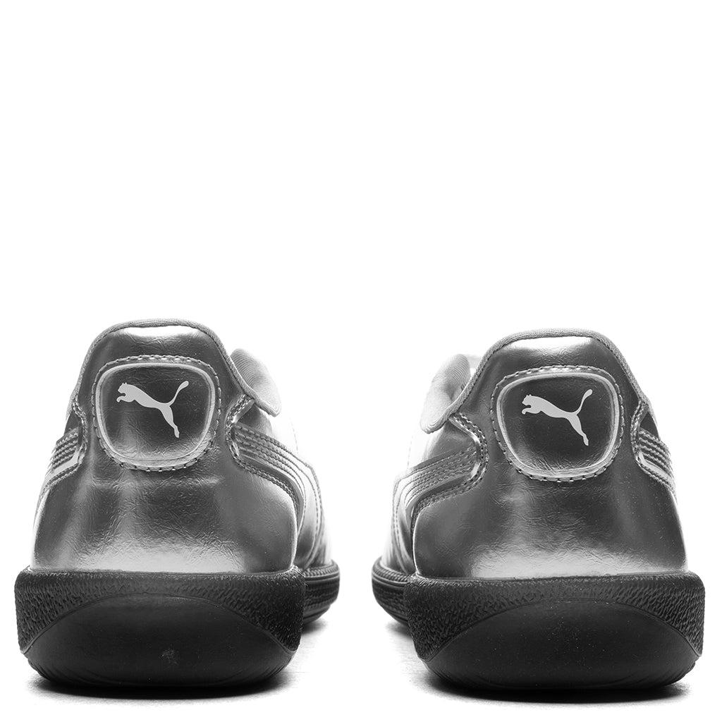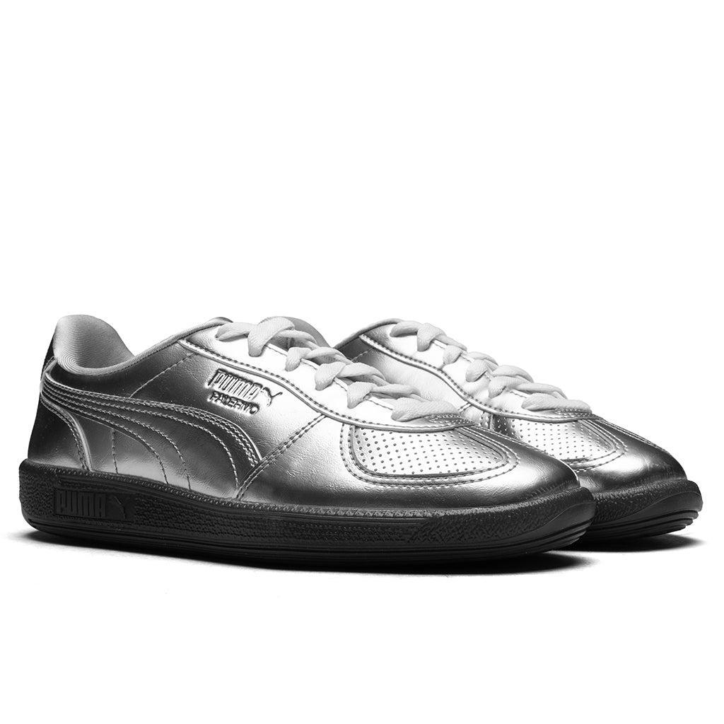 The Puma Palermo Astro Escape has an elevated silhouette with its fully silver metallic upper. The sneaker features classic details like the signature T-toe construction and plush materials. The newest iteration features a full metallic synthetic upper and PUMA Formstrip. The design features Palermo debossing at the upper and printed on the heel. The rubber outsole underneath completes the remainder of the sneaker. Synthetic upper Silver metallic upper PUMA Formstrip Debossed branding Rubber outsole All sizes are listed in US Women's sizing unless stated otherwise Style No: 400450-01
