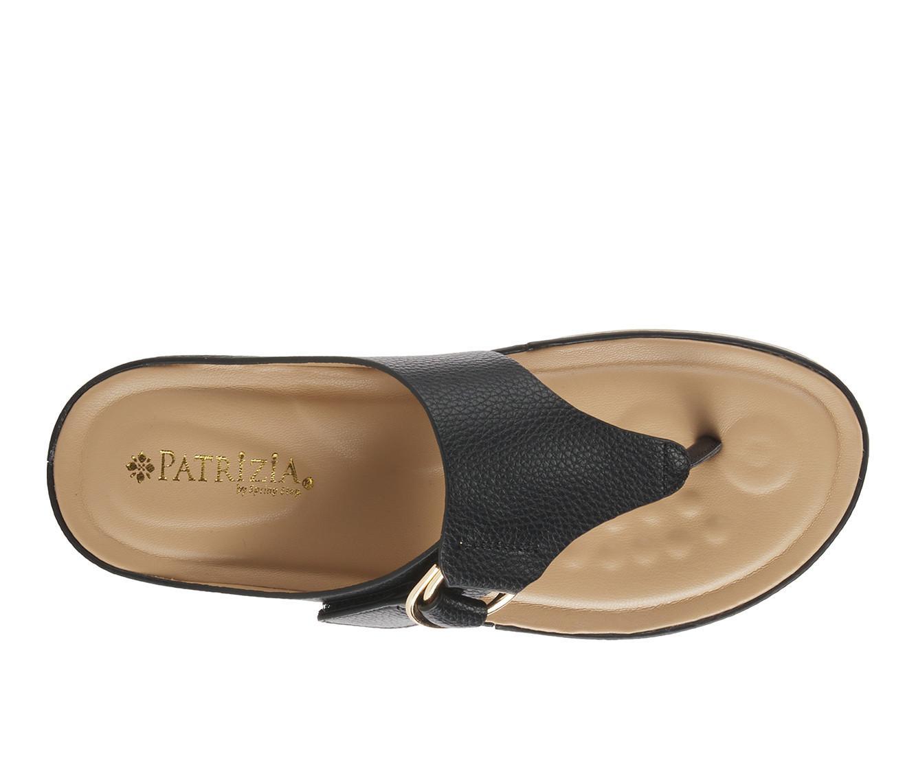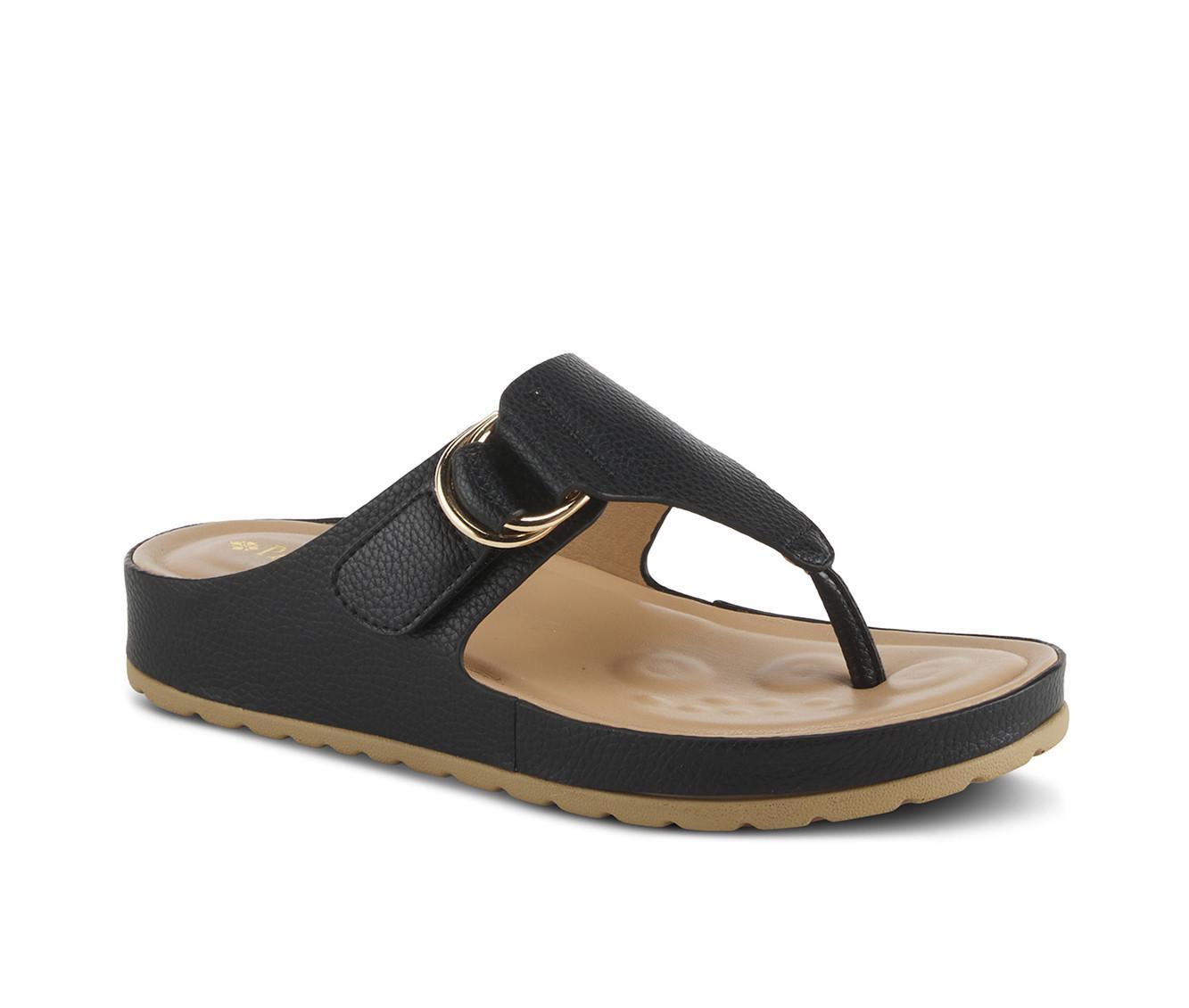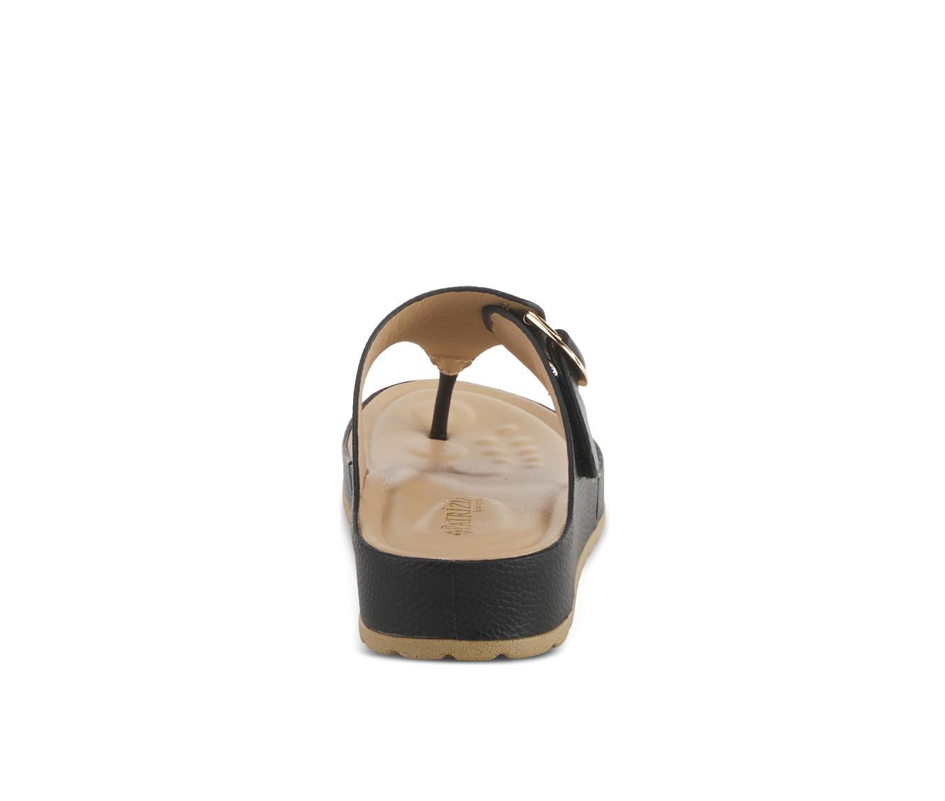 Leather toe thong sandal with gold side buckle on padded footbed for extra support and comfort.