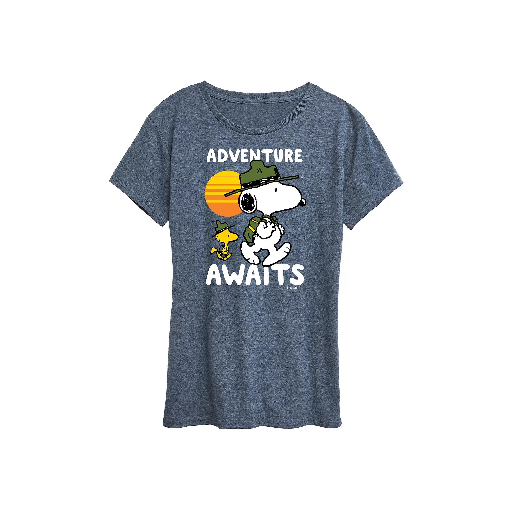 She will love showing off her style with this Womens Peanuts Snoopy & Woodstock Adventure Awaits Graphic Tee. FEATURES Short sleeves CrewneckFABRIC & CARE Solid Color: Cotton ; Heather Colors: Cotton/Polyester Machine wash Imported Size: Large. Color: Med Blue. Gender: female. Age Group: adult.
