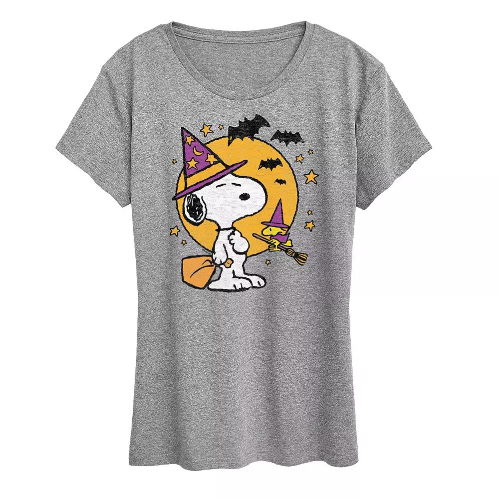 Heather Gray Peanuts Snoopy & Woodstock Witch Graphic Tee - Women & Plus. Short-sleeve tee featuring a festive graphic and cotton-blend fabric.Size S: 26 long from high point of shoulder to hemSize & fit: Relaxed-fit garment with a slightly longer hem. Fits true to size.50% cotton / 50% polyesterMachine wash; tumble dryImported, screen printed in the USA