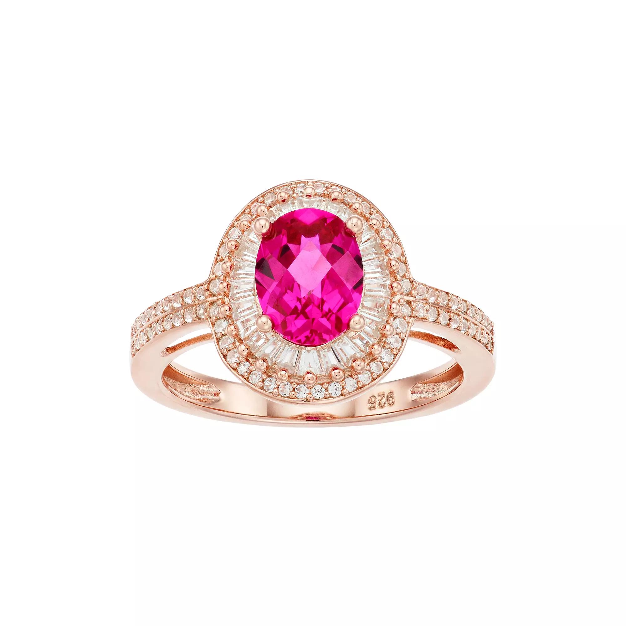 Adorned with a lab-created ruby and lab-created white sapphire accents, this 14k rose gold over silver oval halo ring will complete your look in an eye-catching way. RING DETAILS Width: 19 mm Metal: sterling silver 14k rose gold plated Polished Packaging: boxed STONE DETAILS Stone type: lab-created ruby, lab-created white sapphire Total weight: 1 5/8 ct. Center stone weight: 1 ct. Center stone size: 8 mm x 6 mm Shape: oval, round Setting: prong Gemstones may have been treated to enhance their appearance. Special care may be required. Please visit our Gemstone Treatment & Special Care Guide for more information. Gift Givers: This item ships in its original packaging. If intended as a gift, the packaging may reveal the contents. Size: 7. Gender: female. Age Group: adult. Material: Gold Over Sterling.