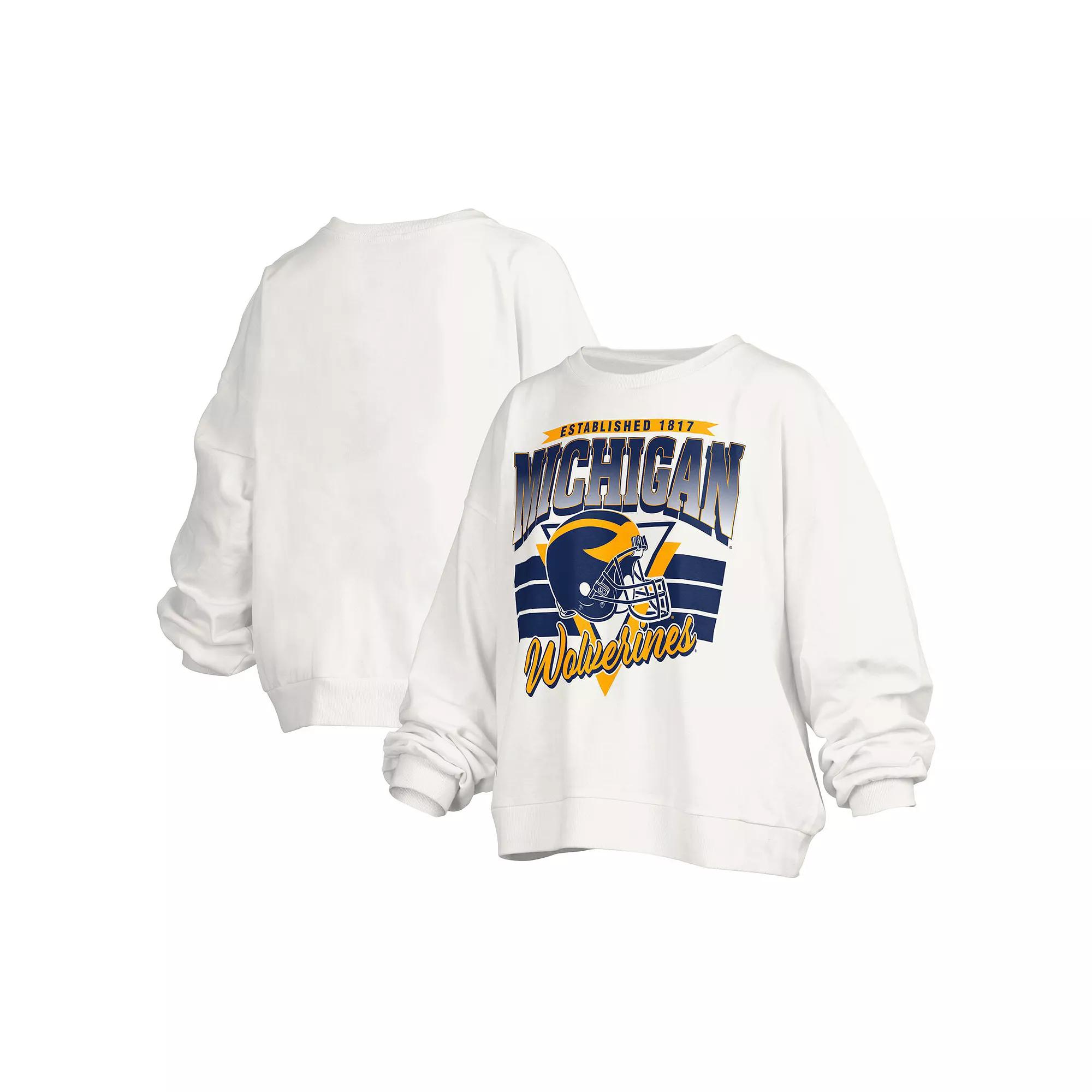 Layer up with a bold display of your unending loyalty to the Michigan Wolverines by grabbing this Janice Retro Logo Oversized Pullover Sweatshirt from Pressbox. It features the university's founding year, a Michigan Wolverines wordmark and a team helmet printed across the torso. The oversized design ensures this extra layer rests comfortably while the midweight design makes this pullover an ideal grab when cooler temperatures arrive. Pullover. Crew neck. Machine wash, tumble dry low. Officially licensed. Brand: Pressbox. Soft fleece lining for an extra layer of warmth. Long sleeve. Midweight sweatshirt suitable for moderate temperatures. Material: 65% Cotton/35% Polyester. Imported. Oversized design for a relaxed fit. Founding year, team wordmark and helmet graphics printed across torso. Size: XL. Color: White. Gender: female. Age Group: adult.