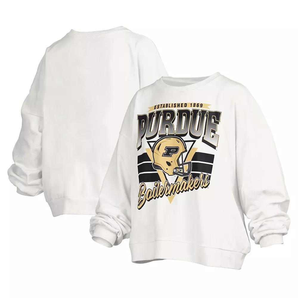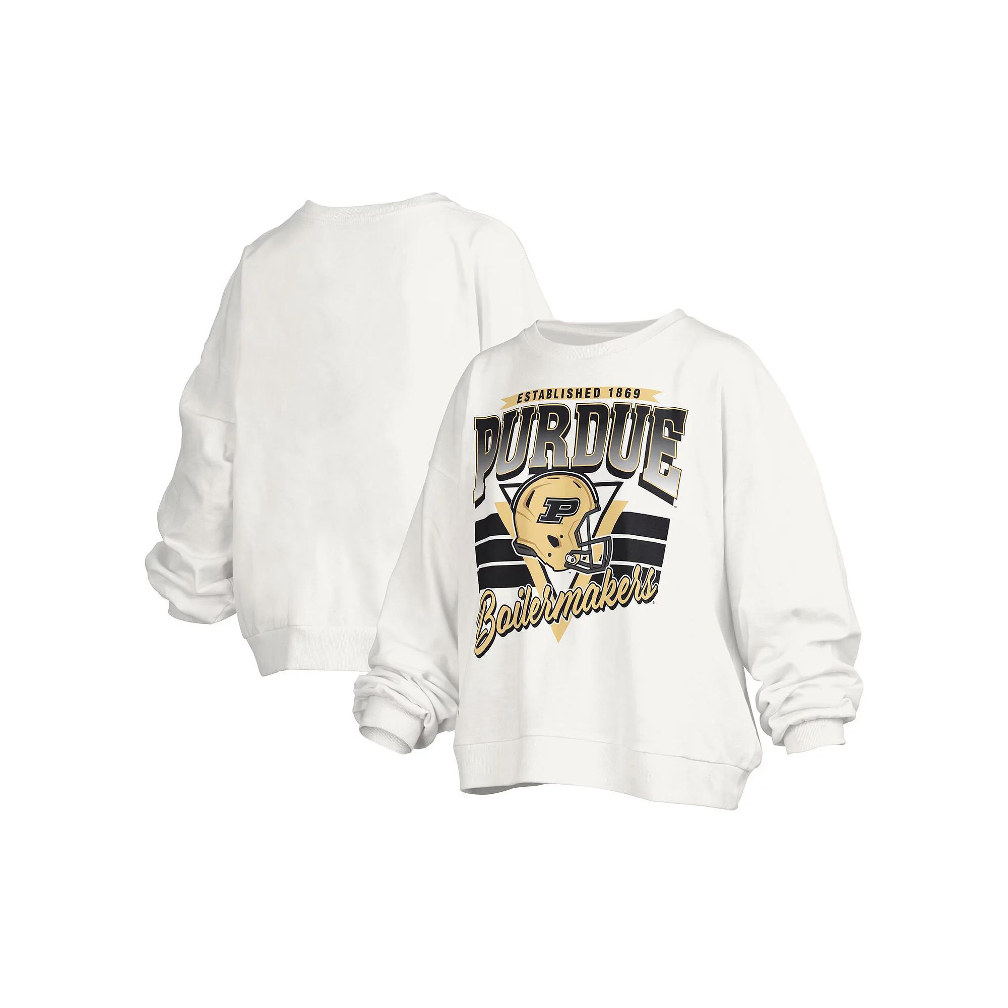 Layer up with a bold display of your unending loyalty to the Purdue Boilermakers by grabbing this Janice Retro Logo Oversized Pullover Sweatshirt from Pressbox. It features the university's founding year, a Purdue Boilermakers wordmark and a team helmet printed across the torso. The oversized design ensures this extra layer rests comfortably while the midweight design makes this pullover an ideal grab when cooler temperatures arrive. Founding year, team wordmark and helmet graphics printed across torso. Pullover. Brand: Pressbox. Long sleeve. Officially licensed. Crew neck. Material: 65% Cotton/35% Polyester. Oversized design for a relaxed fit. Imported. Soft fleece lining for an extra layer of warmth. Machine wash, tumble dry low. Midweight sweatshirt suitable for moderate temperatures. Color: White. Gender: female. Age Group: adult.