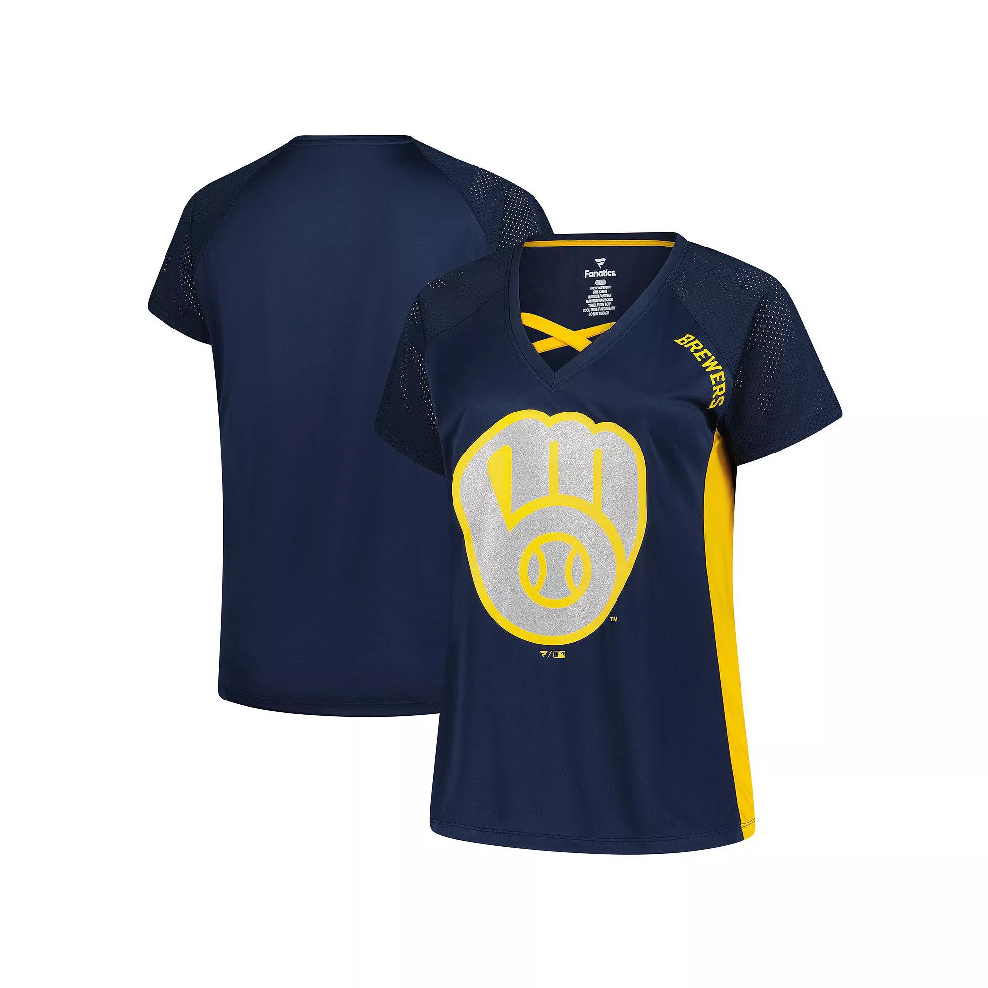 Add some sparkle to your Milwaukee Brewers game day look with this Glitter Raglan V-Neck T-Shirt from Profile. The sewn-in crisscross detail at the neck adds a touch of feminine flair, while the mesh sleeves provide enhanced breathability. Plus, the screen-printed team graphic on the front with glitter detail lets you showcase your Milwaukee Brewers spirit in a fun and fashionable way.Add some sparkle to your Milwaukee Brewers game day look with this Glitter Raglan V-Neck T-Shirt from Profile. The sewn-in crisscross detail at the neck adds a touch of feminine flair, while the mesh sleeves provide enhanced breathability. Plus, the screen-printed team graphic on the front with glitter detail lets you showcase your Milwaukee Brewers spirit in a fun and fashionable way.PRODUCT FEATURESMaterial: 100% PolyesterOfficially licensedBrand: ProfileScreen print team graphic on center front with glitter detailRounded hemSides with contrast team color insetImportedShort sleeveV-neckRaglan sleeves for greater freedom of movement in the shoulders and armsSewn-in crisscross detail at neckMachine wash, tumble dry lowMesh sleeves Size: 2X. Color: Navy. Gender: female. Age Group: adult.