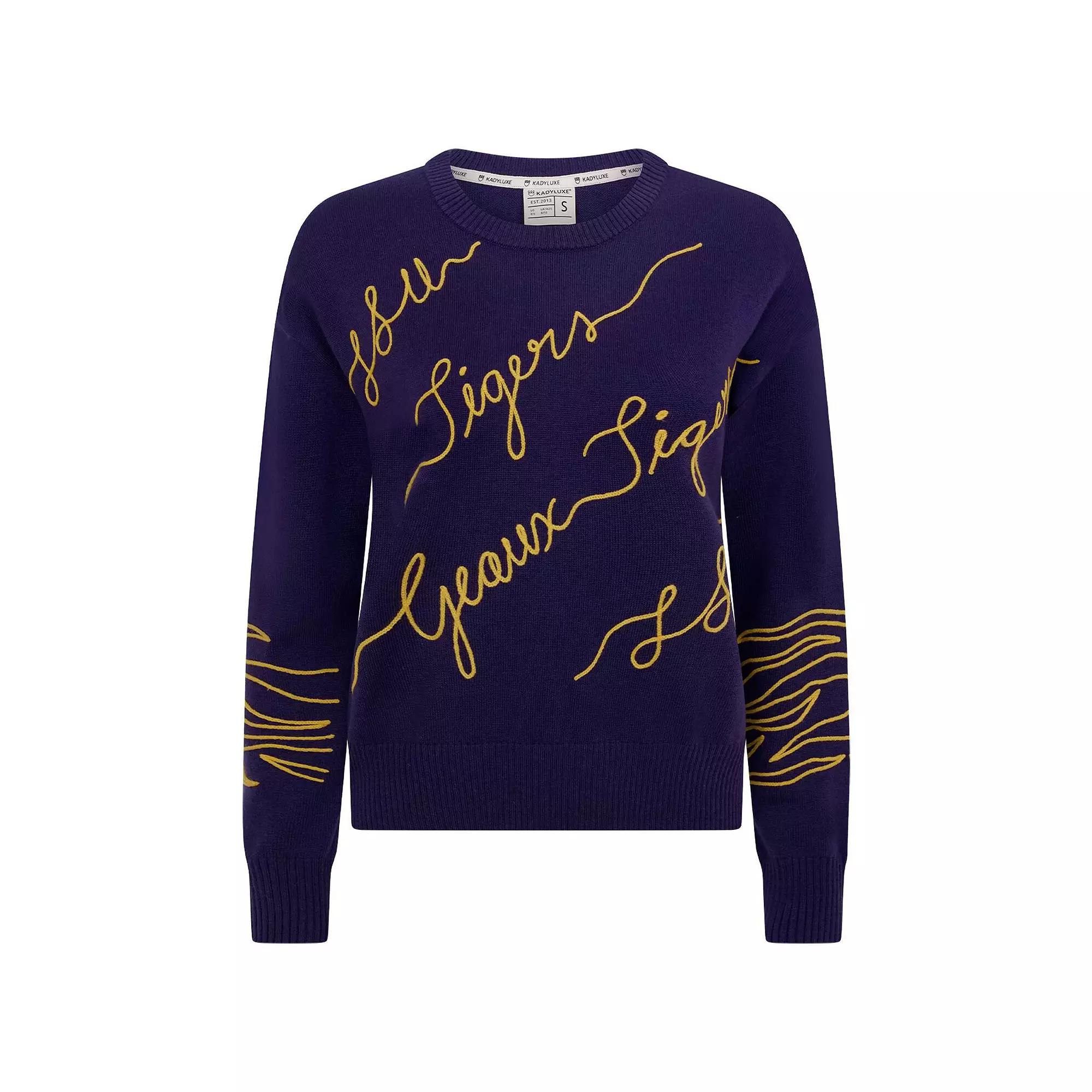 Celebrate your LSU Tigers fandom with this charming Love Note Embroidered Sweater. This cozy sweater is crafted from a blend of premium fabrics for a luxuriously soft feel. The dropped shoulders offer a relaxed fit, while the rib-knit collar, hem, and sleeve cuffs provide added comfort and warmth. Dropped shoulders for a more relaxed feel. Front, back and sleeves with embroidered team logo's and city name. Midweight sweater suitable for moderate temperatures. Rib-knit collar, hem and sleeve cuffs for a snug and comfortable fit. Officially licensed. Material: 40% Polyester/20% Acrylic/20% Merino Wool/ 20% Nylon. Brand: KadyLuxe. Machine wash gentle or dry clean. Tumble dry low, hang dry preferred. Long sleeve. Imported. Crew neck. Pullover. Color: Purple. Gender: female. Age Group: adult. Material: COTTON.