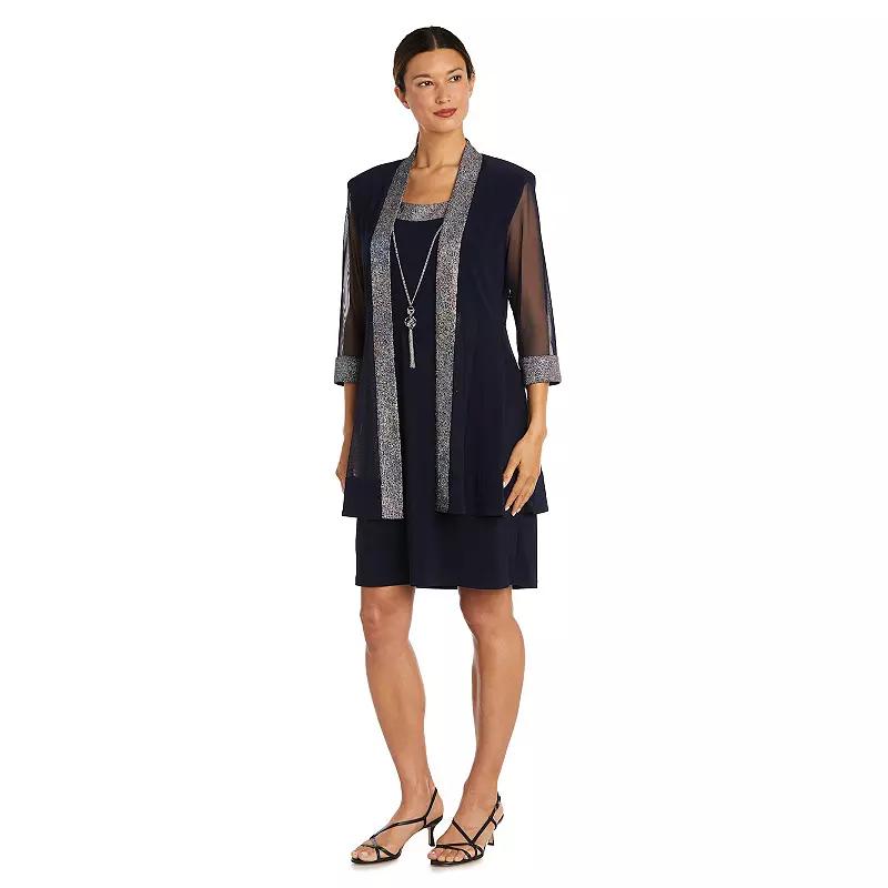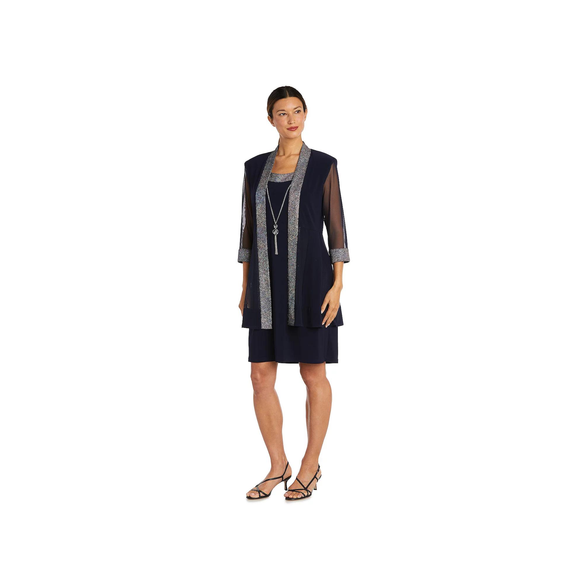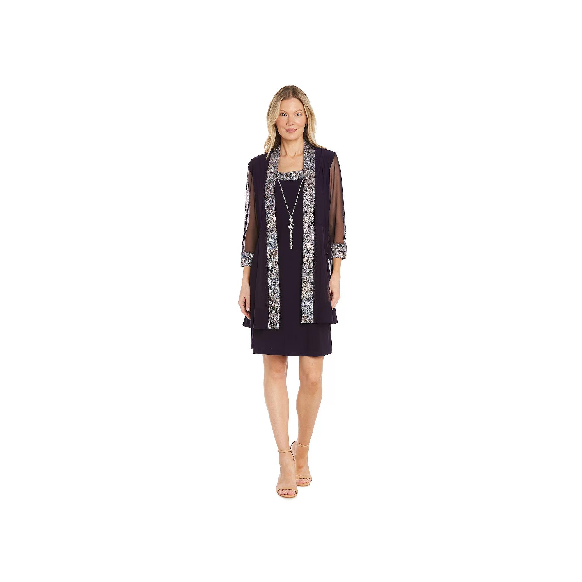 The possibilities are endless with this Womens R&M Richards 2-piece foil knit detail jacket dress. Features shimmering metallic foil. The versatility of the jacket allows for more freedom in styling. Go without the jacket and be bold with earrings and jewelry. Rmoveable Necklace