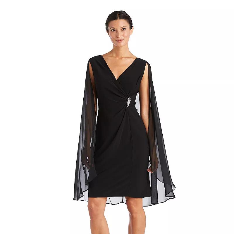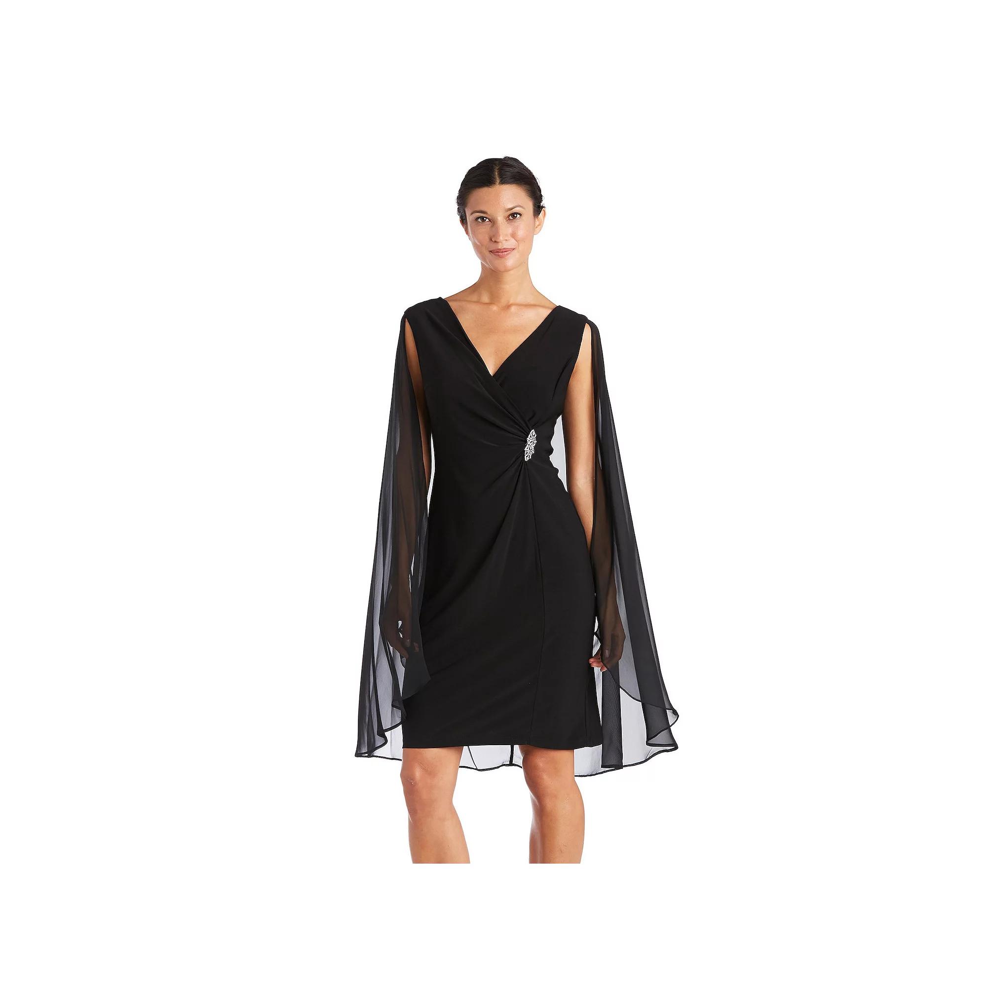 From R & M Richards, this dress features: sheath silhoeutte v-necklinesleeveless attached capelet detail rhinestone brooch at waist straight hemline back zipper closure approx. 39 lengthPolyester/spandex; capelet: polyesterHand wash Imported.