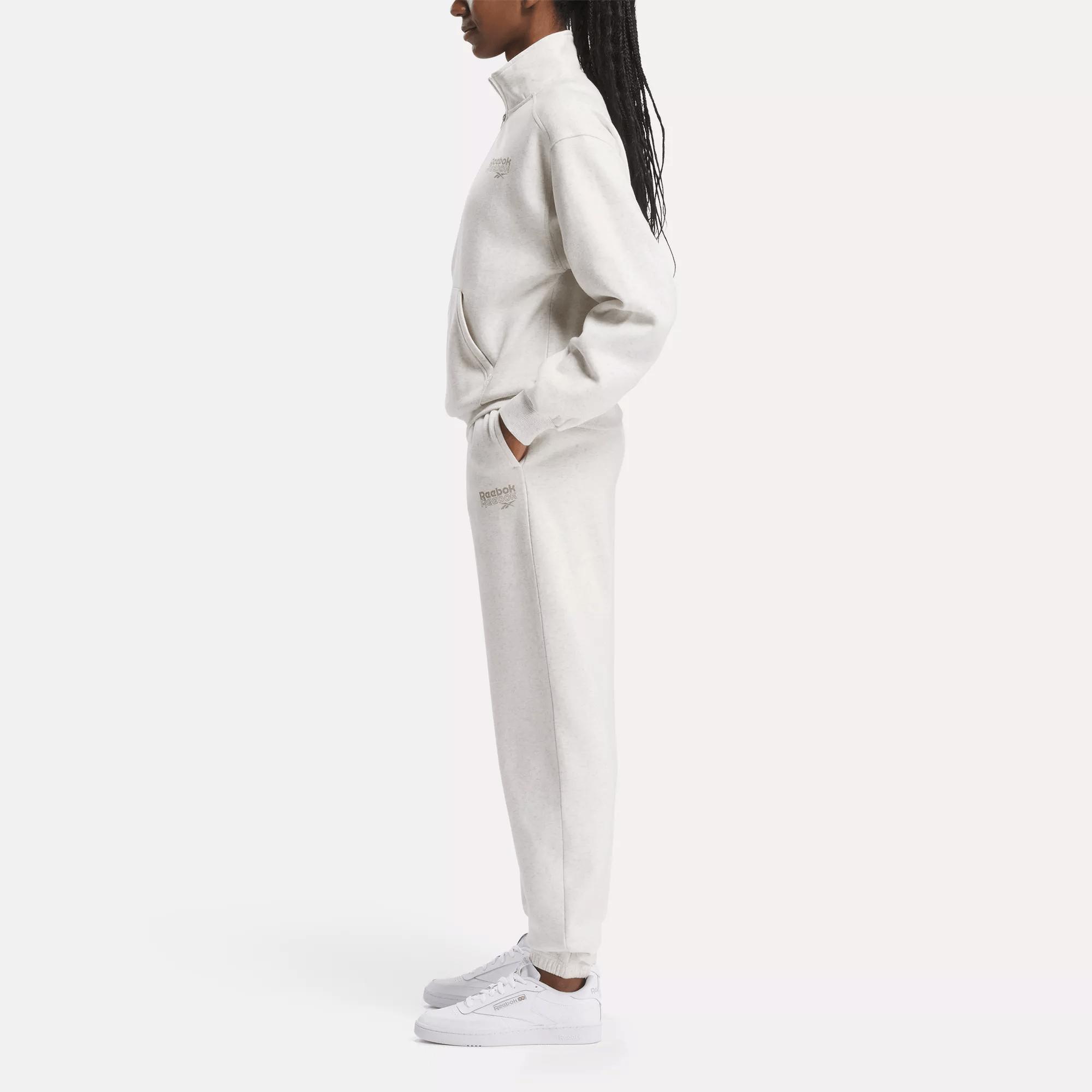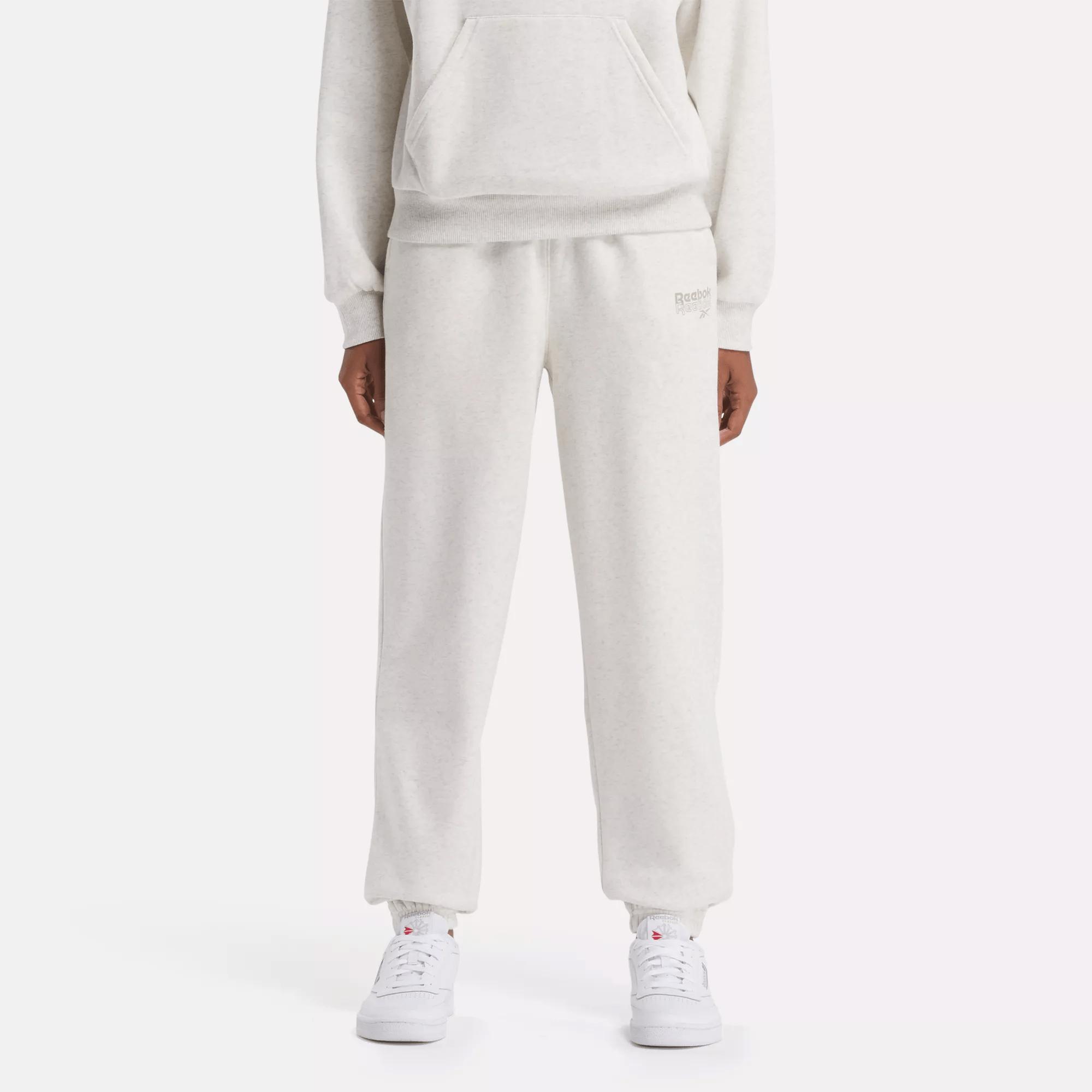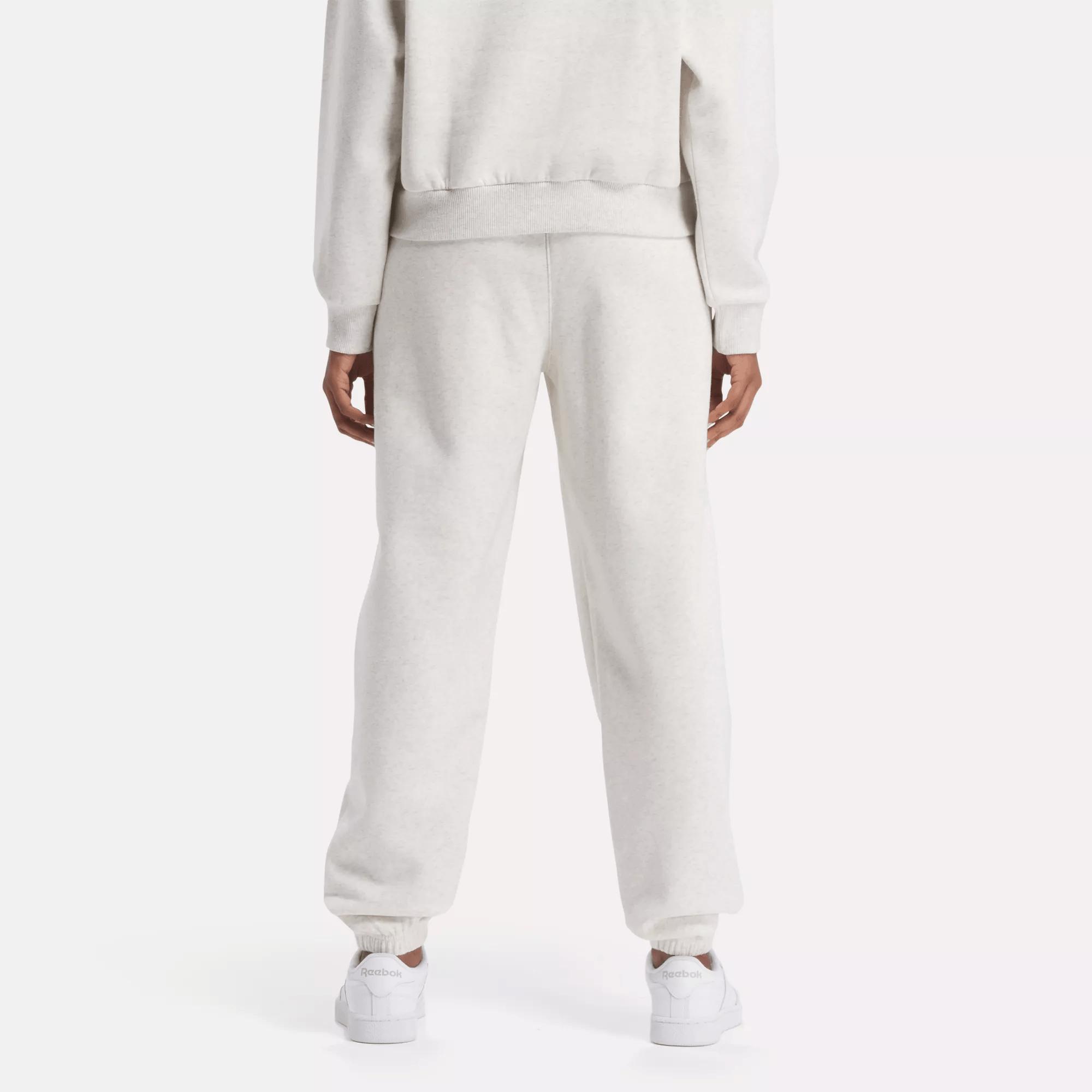 These fleecy soft pants are made from recycled polyester cotton fleeceRest day vibes are all about comfort. These Reebok pants for women take that to heart in a supremely soft fleece fabric that feels great against your skin. The high-rise waist is flexible to give you freedom of movement, and elastic cuffs taper the silhouette.