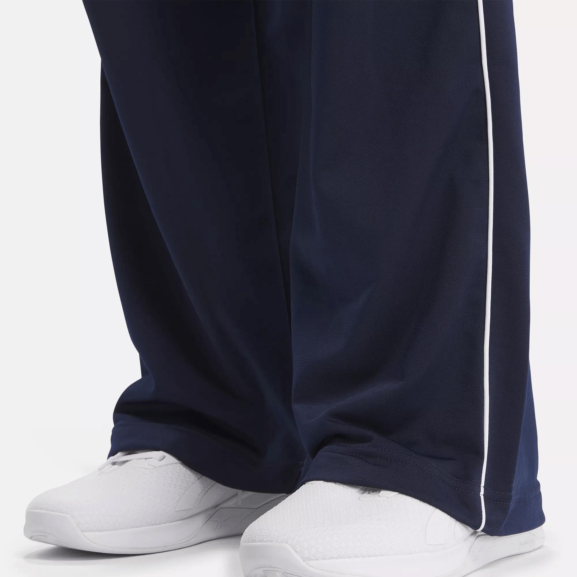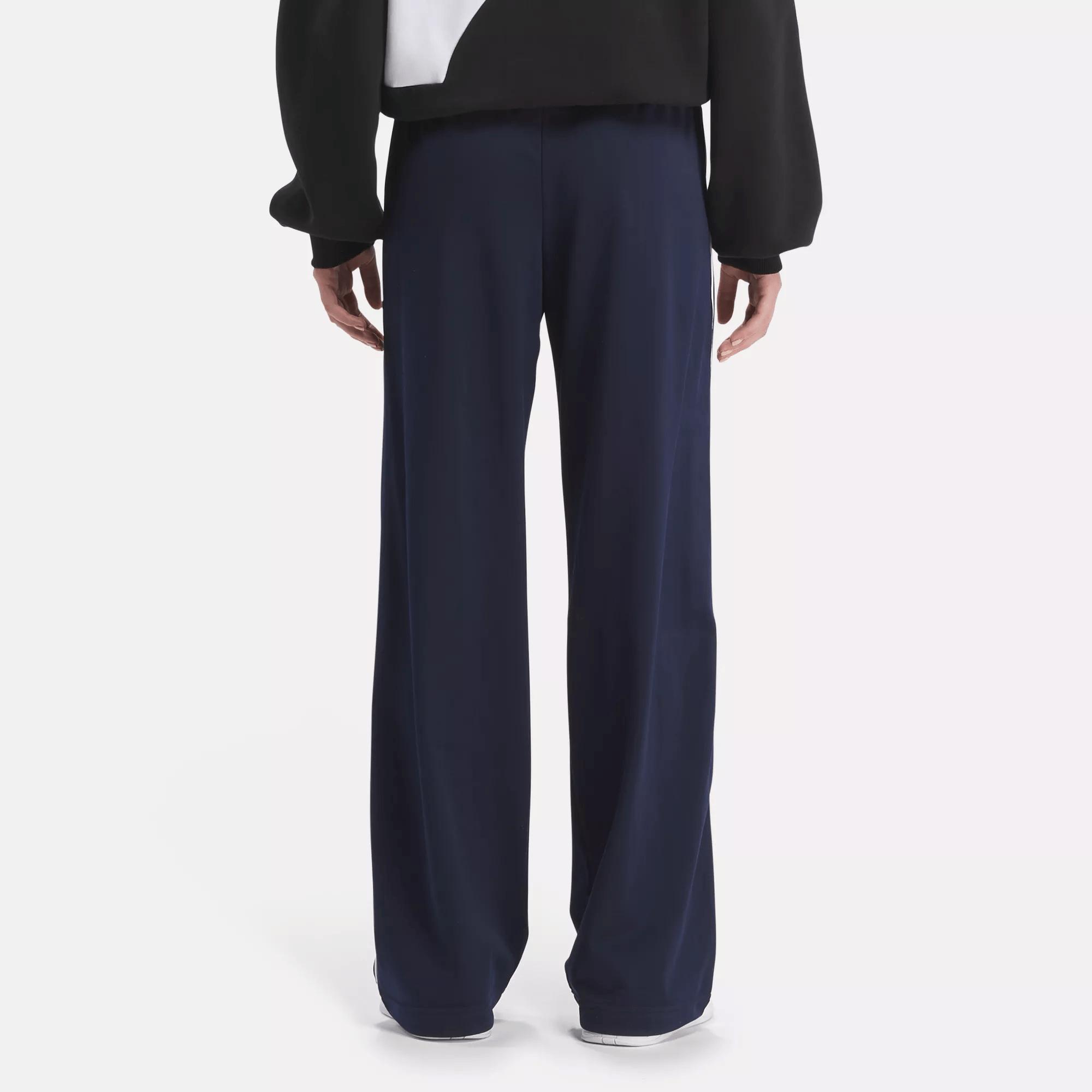 Sporty track pants with a bold Reebok hitNo matter how many times they're reinvented, track pants never go out of style. Smooth, silky tricot fabric gives this women's pair a casual ease and a comfortable feel. An oversized Vector logo on the leg shows some big Reebok love.