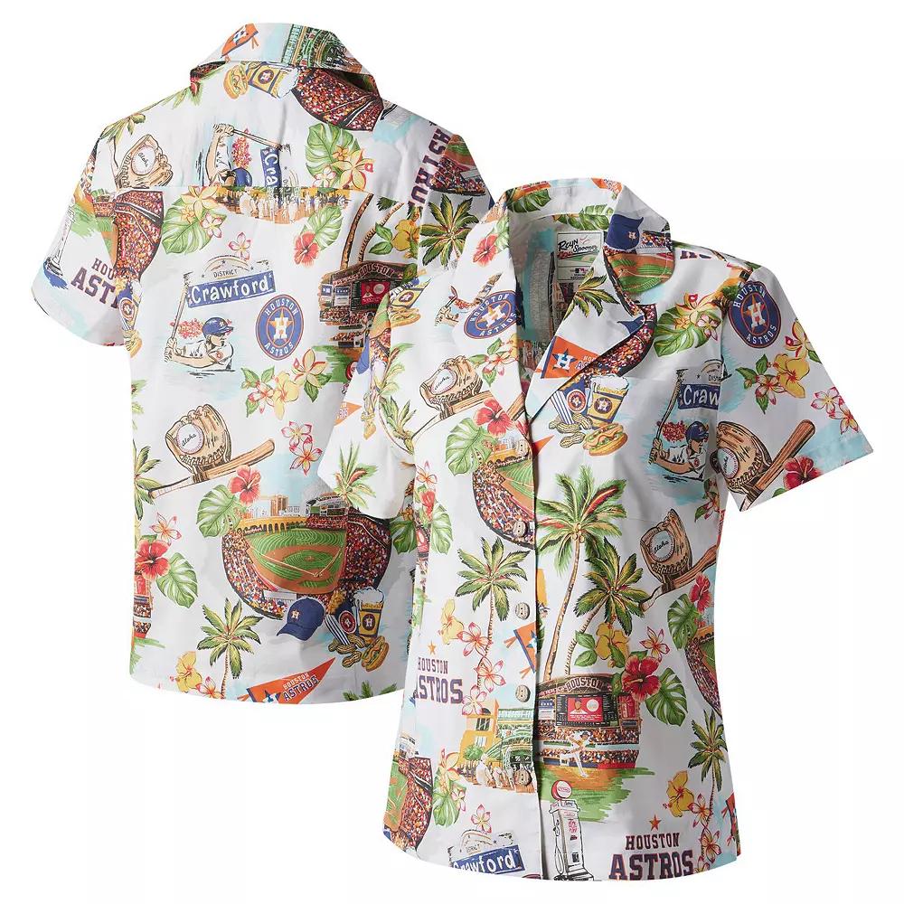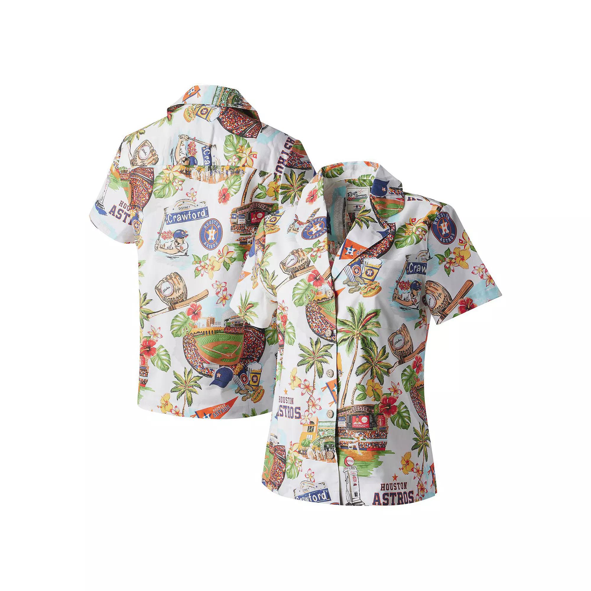 Bring the aloha spirit to game day with this Houston Astros Scenic button-up shirt. Crafted by Reyn Spooner, its hand-painted print features favorite local foods, famous streets and the iconic ballpark. The relaxed fit makes this Houston Astros shirt ideal for casual occasions.Bring the aloha spirit to game day with this Houston Astros Scenic button-up shirt. Crafted by Reyn Spooner, its hand-painted print features favorite local foods, famous streets and the iconic ballpark. The relaxed fit makes this Houston Astros shirt ideal for casual occasions.PRODUCT FEATURESMaterial: 100% CottonShort sleeveOfficially licensedBaseball-shaped coconut buttonsMachine wash, tumble dry lowFull-button frontRelaxed fitImportedBrand: Reyn SpoonerAllover printed design Size: XS. Color: White. Gender: female. Age Group: adult.