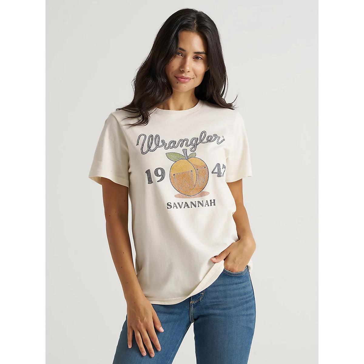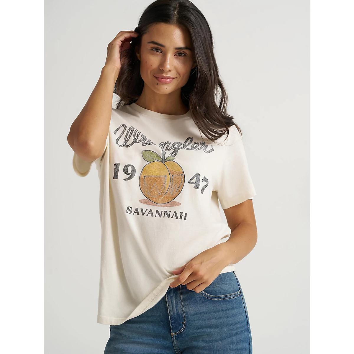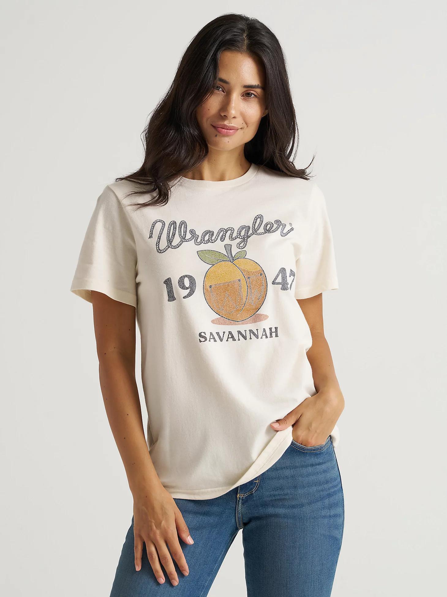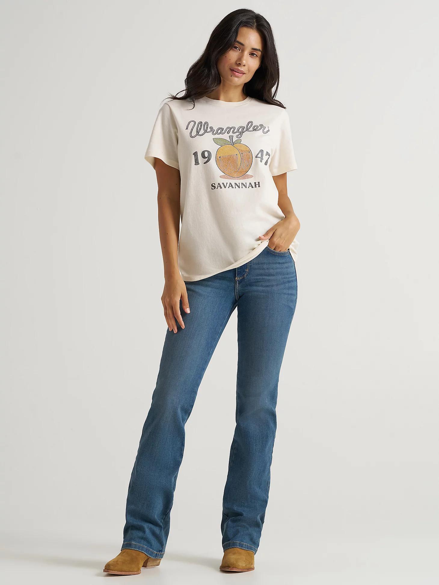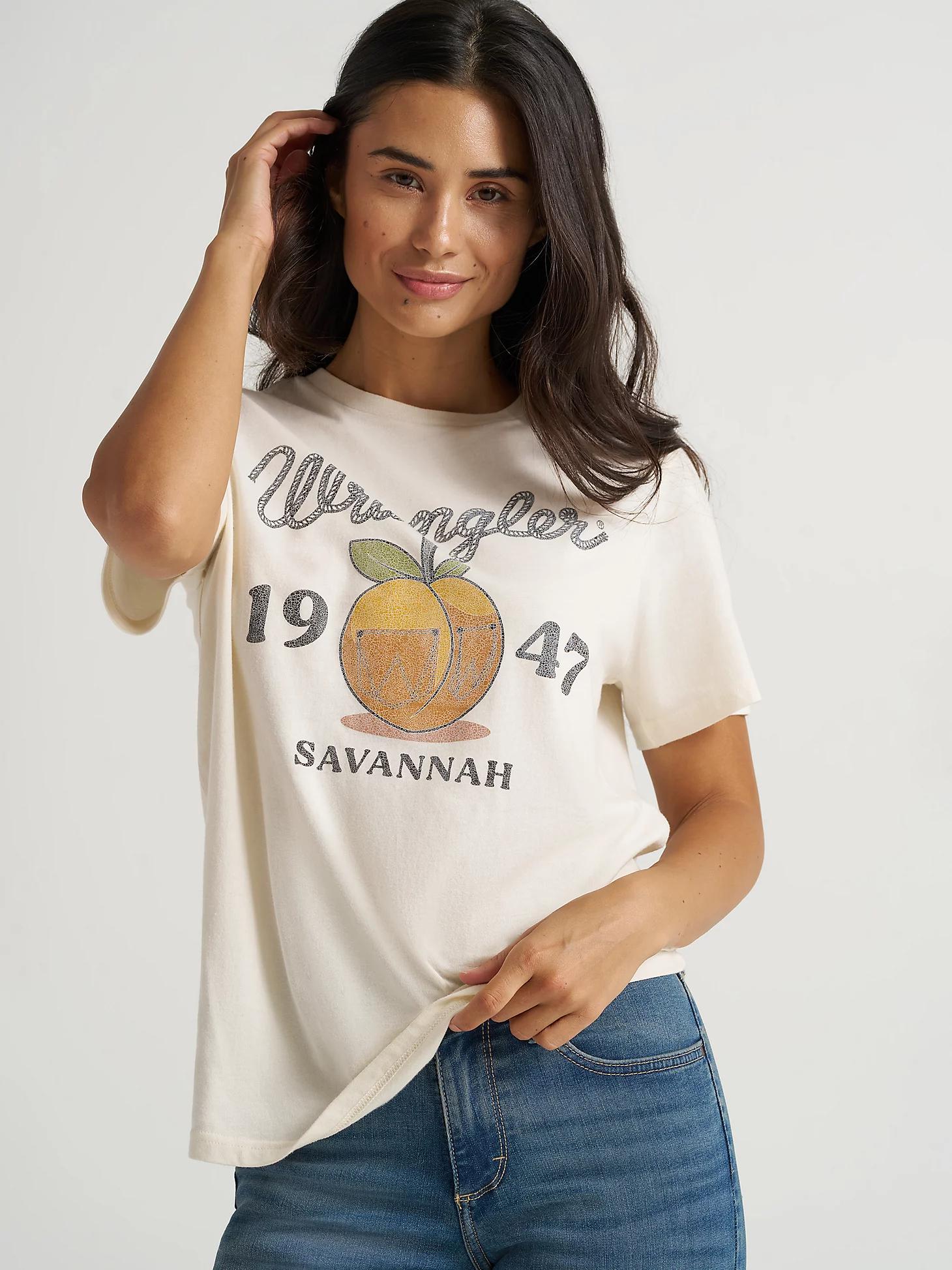 You’ll feel peachy-keen anytime you’re wearing our Women’s Savannah Peach Graphic Tee. It’s crafted from cotton to keep you feeling as good as you look in this laidback style. Plus, its regular fit is cut perfectly for you—not too tight or too loose. It comes with the Wrangler® rope logo and a retro-inspired Georgia peach graphic with its own ‘W’ patch pockets.