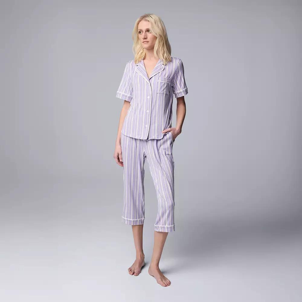 You're sure to love the look and fit of this women's Simply Vera Vera Wang two-piece short sleeve notch collar pajama top and capri pajama bottoms set.Click on this WOMEN'S GUIDE to find the perfect fit and more!You're sure to love the look and fit of this women's Simply Vera Vera Wang two-piece short sleeve notch collar pajama top and capri pajama bottoms set.Click on this WOMEN'S GUIDE to find the perfect fit and more!FEATURES Includes: pajama top and pajama bottoms Top: notch collar neckline, button front closure, short set-in sleeves, vented hem, 1 chest pocket Bottoms: covered elastic waistband, 2 side seam pockets Lightweight cozy jersey construction UnlinedFIT & SIZING Relaxed fit 21-in. inseam Straight, 8 1/4-in. leg opening Super high rise sits on the natural waistlineFABRIC & CARE Polyester, spandex Machine wash and tumble dry low Imported Size: Xxl. Color: Lilac Stripe. Gender: female. Age Group: adult.