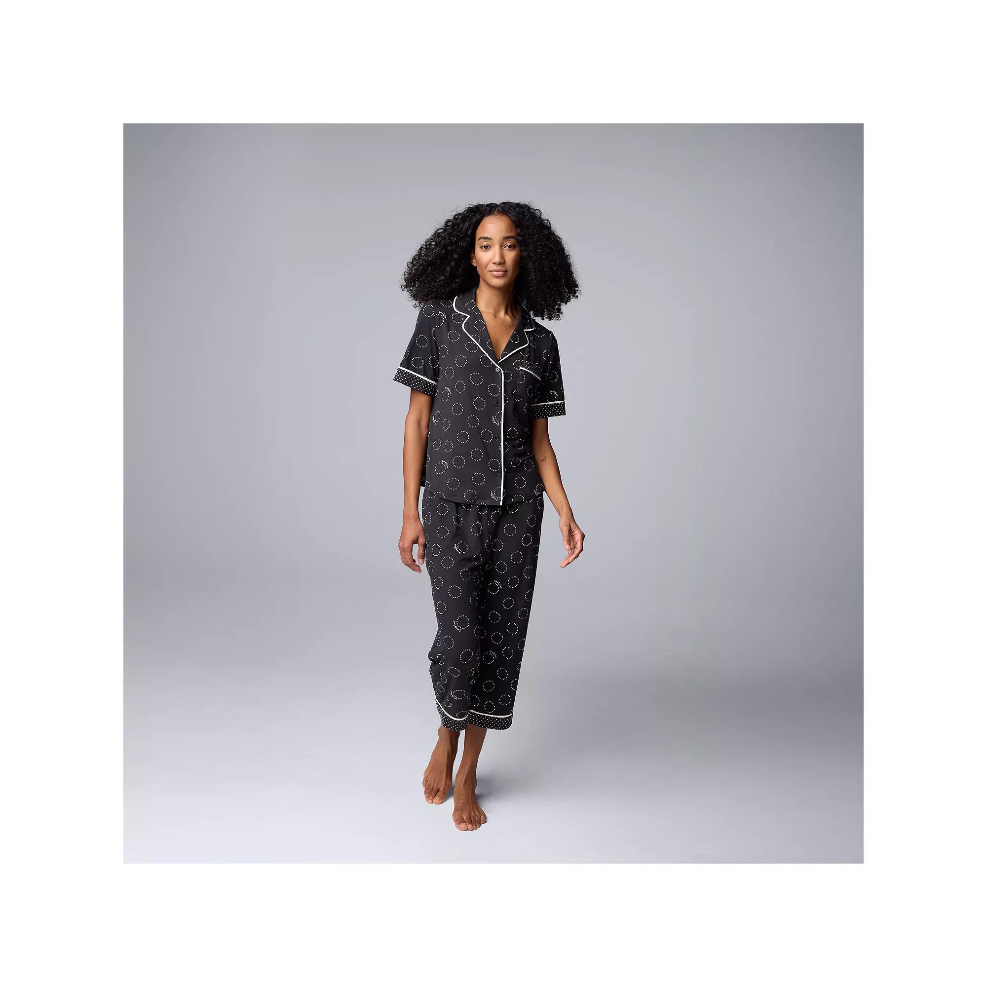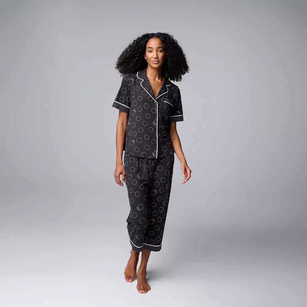 Youre sure to love the look and fit of this womens Simply Vera Vera Wang two-piece short sleeve notch collar pajama top and capri pajama bottoms set.Click on this WOMENS GUIDE to find the perfect fit and more!Youre sure to love the look and fit of this womens Simply Vera Vera Wang two-piece short sleeve notch collar pajama top and capri pajama bottoms set.Click on this WOMENS GUIDE to find the perfect fit and more!FEATURES Includes: pajama top and pajama bottoms Top: notch collar neckline, button front closure, short set-in sleeves, vented hem, 1 chest pocket Bottoms: covered elastic waistband, 2 side seam pockets Lightweight cozy jersey construction UnlinedFIT & SIZING Relaxed fit 21-in. inseam Straight, 8 1/4-in. leg opening Super high rise sits on the natural waistlineFABRIC & CARE Polyester, spandex Machine wash and tumble dry low Imported Size: Xxl. Color: Black Circles. Gender: female. Age Group: adult.