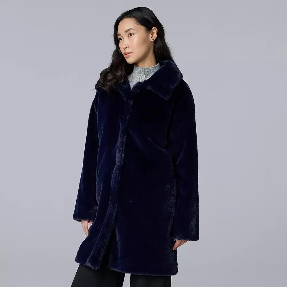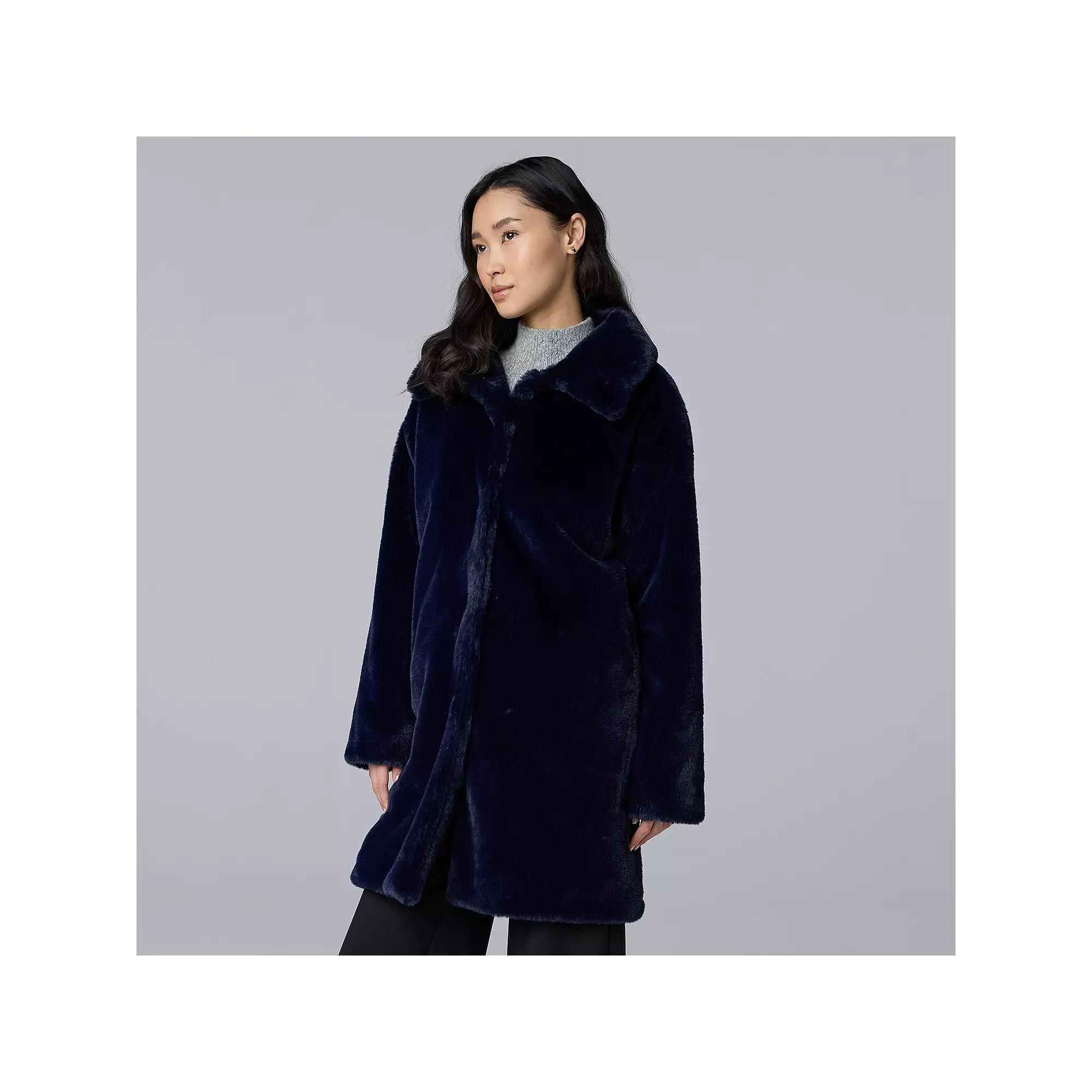 Step out in style with this luxurious faux fur coat from Simply Vera Vera Wang, perfect for adding a touch of elegance to your chilly weather wardrobe. Its chic silhouette offers the perfect balance of warmth and sophistication, making it an ideal layering piece for both casual outings and special occasions. Click on this WOMEN'S GUIDE to find the perfect fit and more! - https://www.kohls.com/feature/womens-fit-guide.jsp. FEATURES: Luxurious faux fur material for a stylish look, Soft and cozy design perfect for colder weather. FIT & SIZE: Regular fit, 36-in. from shoulder to hem. DETAILS: Snap closure, Long set-in sleeves, 2 side pockets, Imported. MATERIAL & CARE: Faux fur shell: polyester, Lining: polyester, Fully lined, Machine wash. Size: Medium. Color: Liberty Navy. Gender: female. Age Group: adult. Material: OTHER MATERIAL.