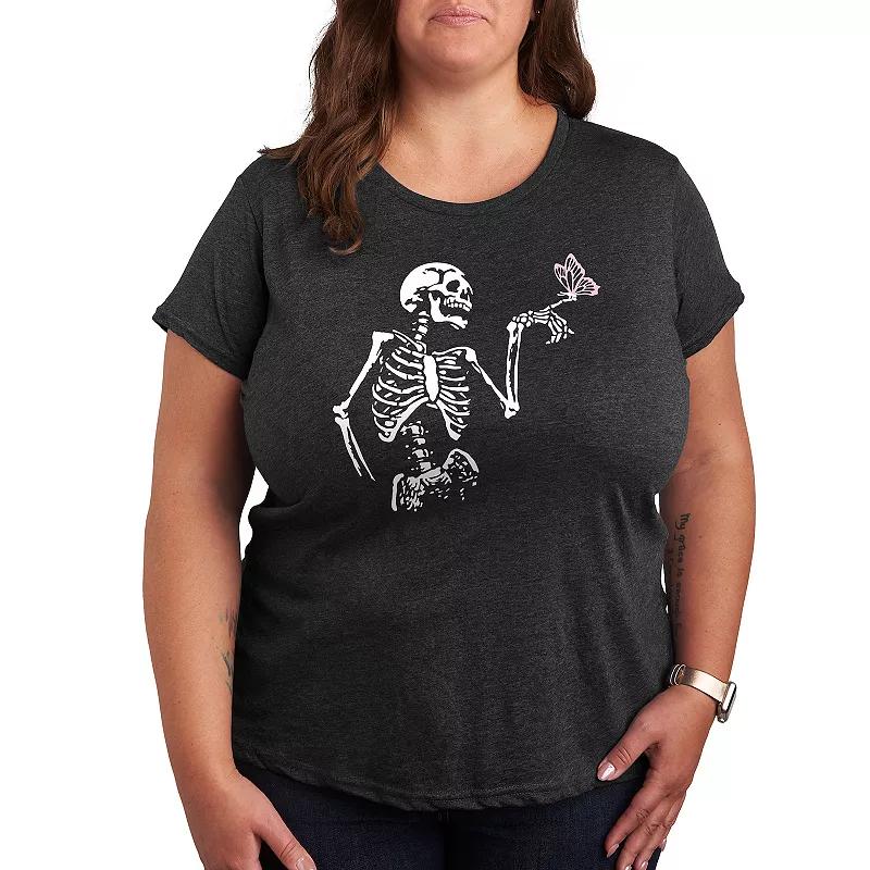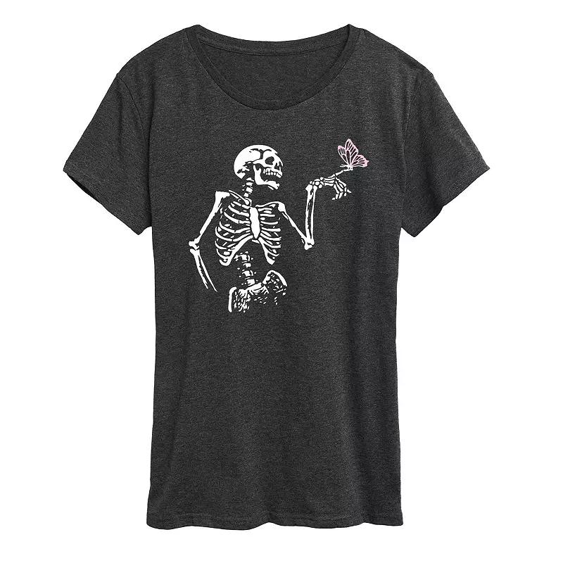 Heather Charcoal Skeleton With Butterfly Graphic Tee - Women & Plus. Reach for this soft and breathable cotton-blend tee when youre craving comfort. The charming graphic infuses the days ensemble with a dash of personality. Size S: 26 long from high point of shoulder to hem50% cotton / 50% polyesterMachine wash; tumble dry Imported, screen printed in the USA