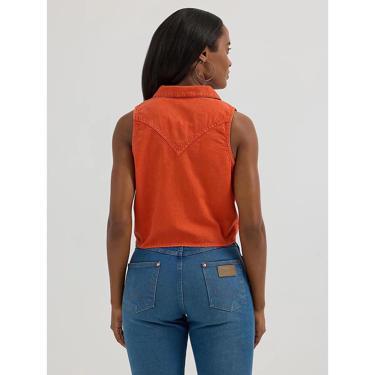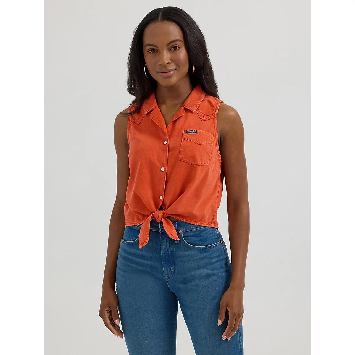 Shop the Women's Sleeveless Tie Front Camp Shirt on Wrangler.com, the official website for Wrangler TOPS and all your favorite Wrangler women's apparel.