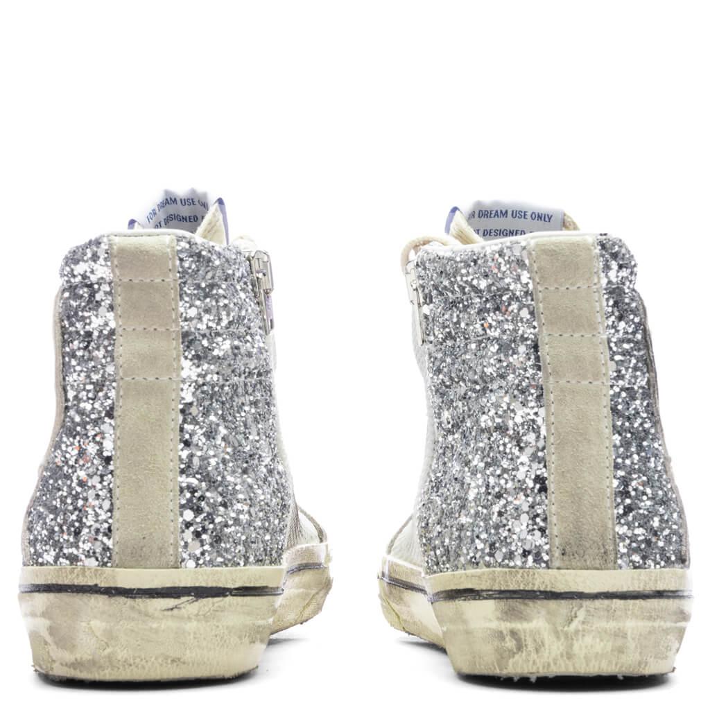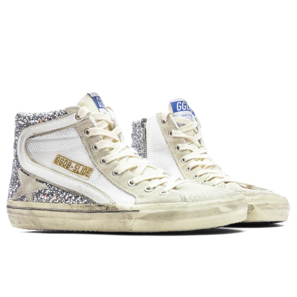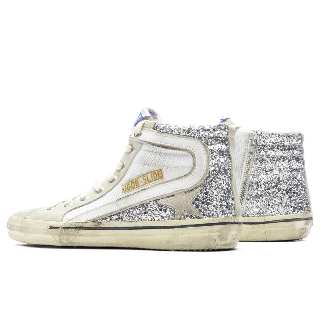 The Golden Goose Women’s Slide Sneaker is a luxurious take on the everyday footwear silhouette. The sneaker utilizes a blend of suede, textile, and embellished sequins within the upper. The sneaker has a side zipper closure along with a lace-up front and padded collar. The intentional distressing and rubber outsole finishes up the remainder of the sneaker. Suede/textile/sequin upper Side zipper closure Lace-up front Padded collar Intentional distressing Rubber outsole All sizes are listed in European Women’s sizing unless stated otherwise Style No: GWF00116.F004148.60404 GWF00116 F004148 60404