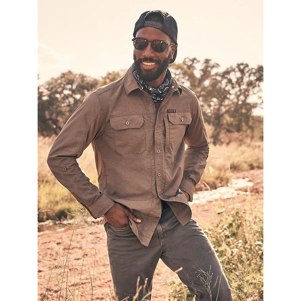 MIXED MATERIAL FOR OUTDOOR COMFORTATG by Wrangler™ is a collection of everyday outdoor styles that will keep you dry and comfortable in all conditions. This mix material shirt has it all: style, functionality, and protection. Its mixed material design incorporates contrasting, breathable knit panels at the sides and sleeves for optimum comfort and mobility. This shirt features a regular fit with convertible roll-up back capping on the sleeves, moisture-wicking properties, and UPF 30 protection for those sunny days. We also added a utility zip pocket and a glasses cleaner at the hem to ensure you are ready for wherever the day takes you.