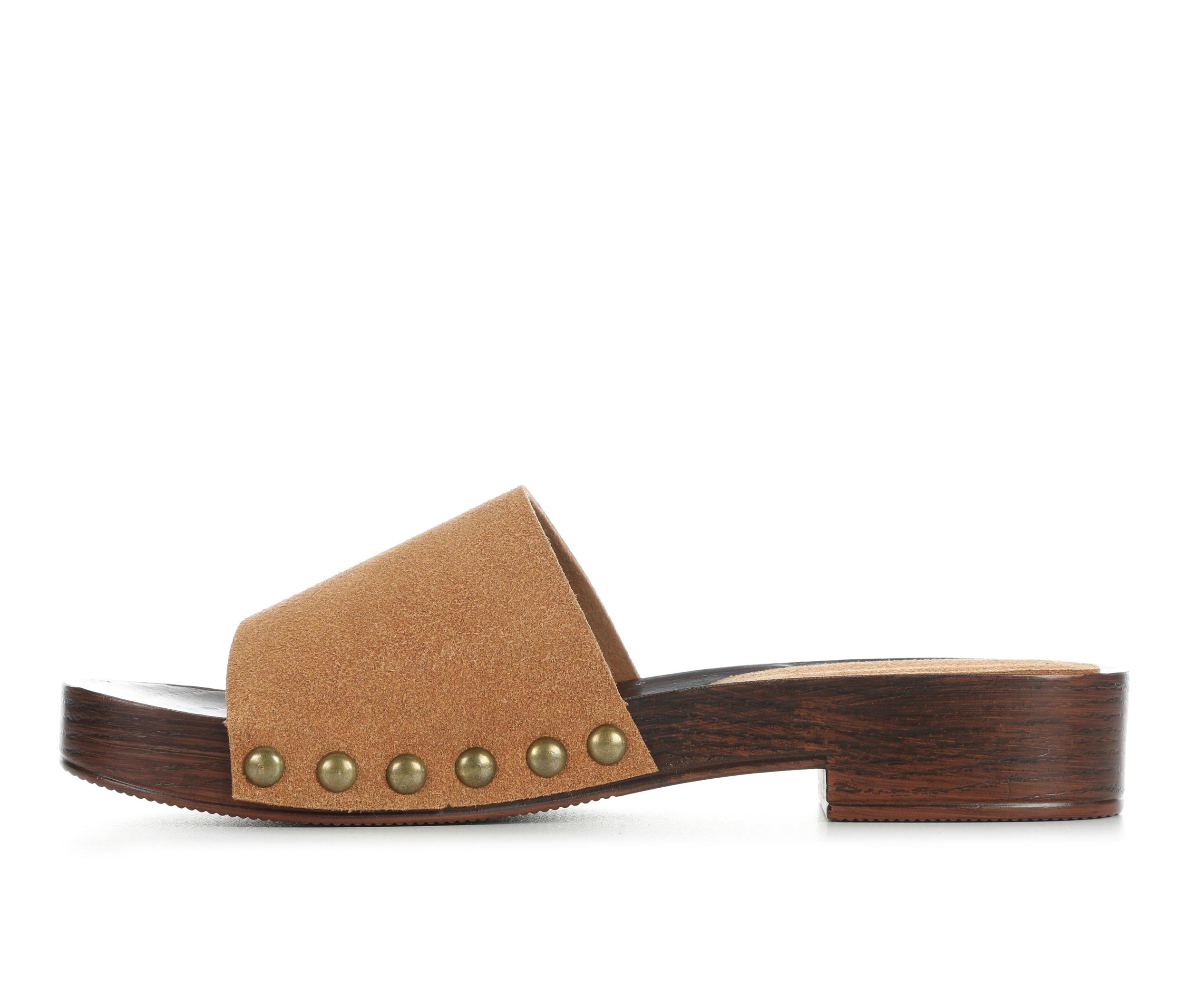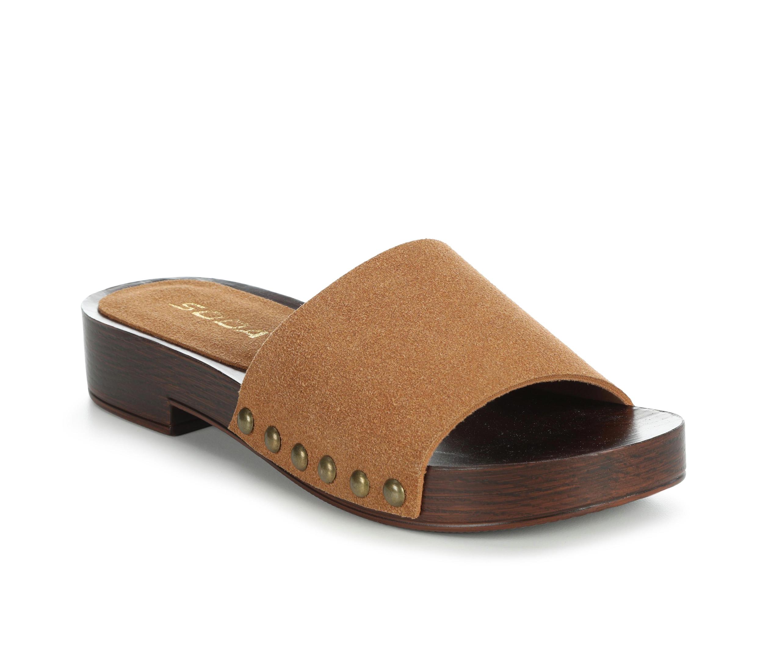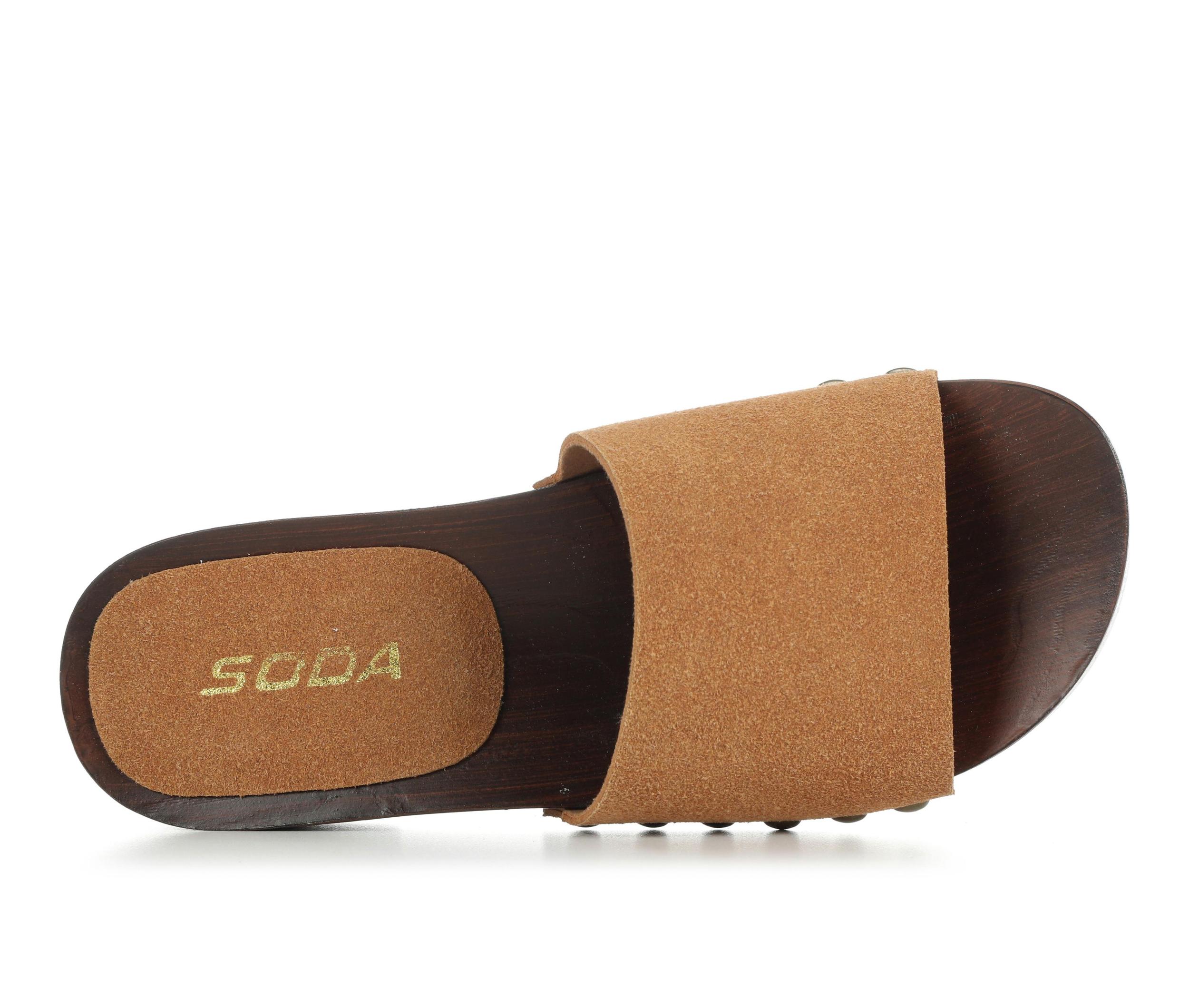 The Soda Damani-S is an open-toe slip-on slide sandal designed for easy, warm-weather wear. It features a wide suede-like strap with nailhead-style stud detailing along the edge for a touch of texture. A low block heel and wood-look base give it a simple, casual lift for everyday outfits.