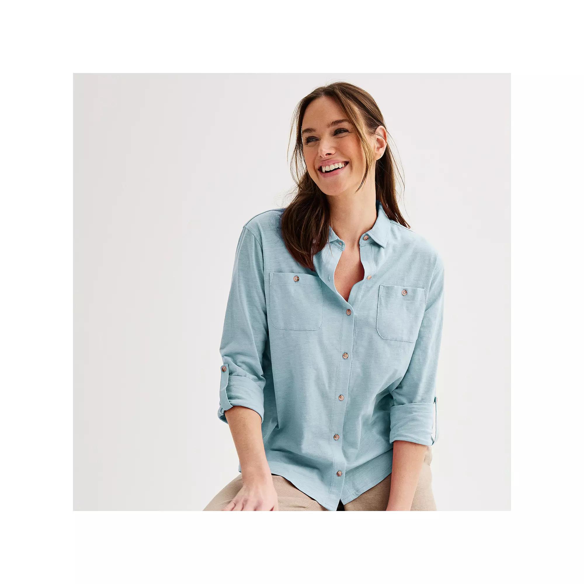 Easy, simple, and comfortable. This women's Sonoma Goods for Life button front knit top is the perfect addition to any wardrobe. Click on this WOMEN'S GUIDE to find the perfect fit and more!Easy, simple, and comfortable. This women's Sonoma Goods for Life button front knit top is the perfect addition to any wardrobe. Click on this WOMEN'S GUIDE to find the perfect fit and more!FEATURES 2 chest pockets with button closure Button closure Cuffed long sleeves with buttons Collared necklineFABRIC & CARE Cotton, polyester Machine wash Imported Size: Small. Color: Peri Dusk. Gender: female. Age Group: adult.