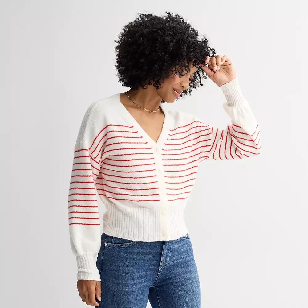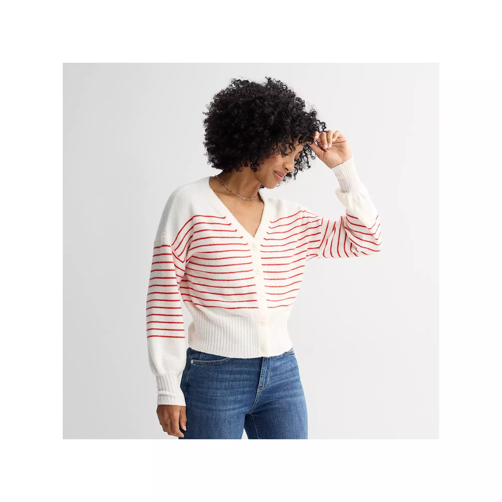 Layer with style with this Button Front Cardigan from Sonoma Goods For Life.Click on this WOMEN'S GUIDE to find the perfect fit and more! FEATURES V-neck Button front Long balloon sleeves Ribbed cuffsFIT & SIZING 20 3/4-in. length from shoulder to hemFABRIC & CARE 85% recycled polyester, 13% viscose, 2% spandex Machine wash delicate ImportedRESPONSIBLE Contains recycled polyester Size: X Small. Color: Neutral Red Stripe. Gender: female. Age Group: adult. Material: Cotton Blend.
