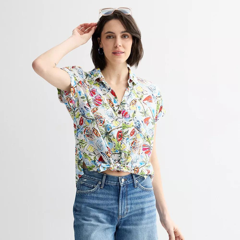Elevate your casual wardrobe with this womens Sonoma Goods For Life camp shirt. Click on this WOMENS GUIDE to find the perfect fit and more!FEATURES Collared neckline Short dolman sleeves Button front Rounded cuffs Shirttail hemFIT & SIZING 26 1/2-in. length from shoulder to hemFABRIC & CARE Linen, rayon Chambray mini stripe: lyocel Machine wash Imported Size: Small. Color: Fun Team Print. Gender: female. Age Group: adult.