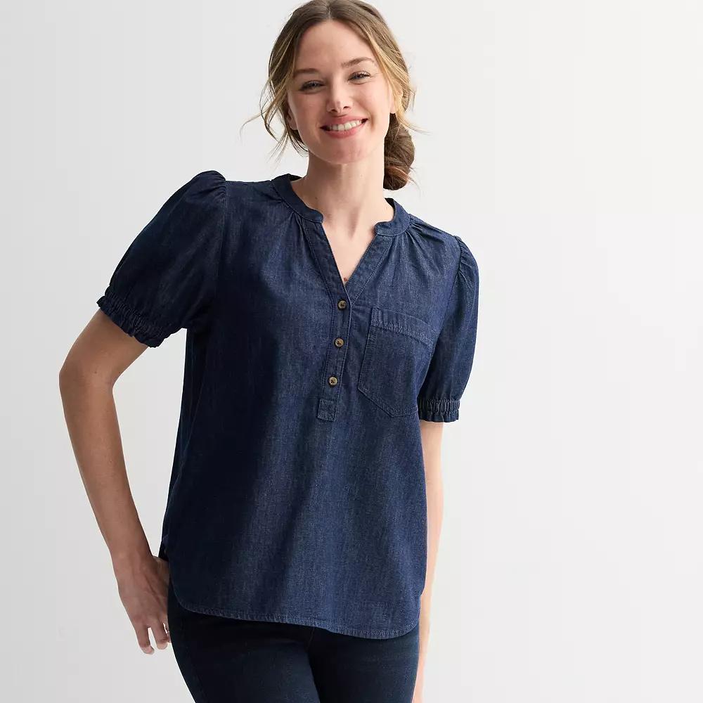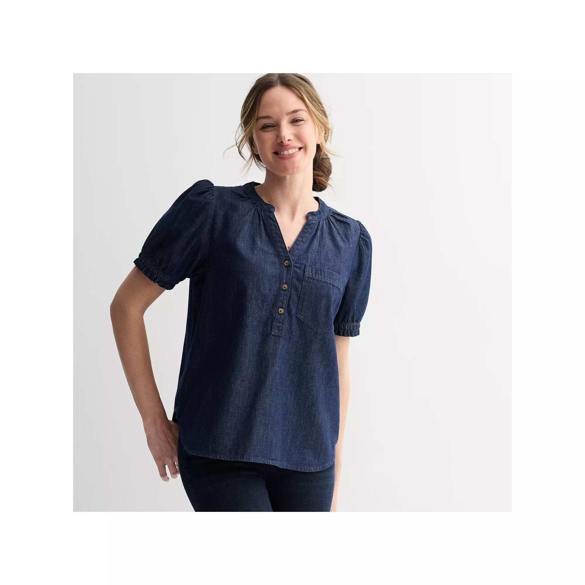 Elevate your casual wardrobe with this stylish short sleeve denim shirt from Sonoma Goods For Life. Perfect for layering or wearing alone, its relaxed fit makes it an ideal choice for weekend outings or easygoing days at home. Click on this WOMEN'S GUIDE to find the perfect fit and more! - https://www.kohls.com/feature/womens-fit-guide.jsp. FEATURES: Soft fabric feel, 1 functional front pocket, Shirttail hem, 3-button front, Rounded cuffs, Short sleeves, U-neck neckline. FIT & SIZING: 26-in. length, Mini length, hits at the thigh. FABRIC & CARE: 100% cotton, Machine wash and tumble dry low, Imported. RESPONSIBLE Supports more sustainable cotton farming, Tested for harmful substances, STANDARD 100 by OEKO-TEX® CERTIFIED, Certification No. 2017OK1349, Testing Institute: AITEX®, www.oeko-tex.com/standard100 - https://www.oeko-tex.com/en/our-standards/oeko-tex-standard-100. Size: Medium. Color: Raw Dark. Gender: female. Age Group: adult. Material: OTHER MATERIAL.