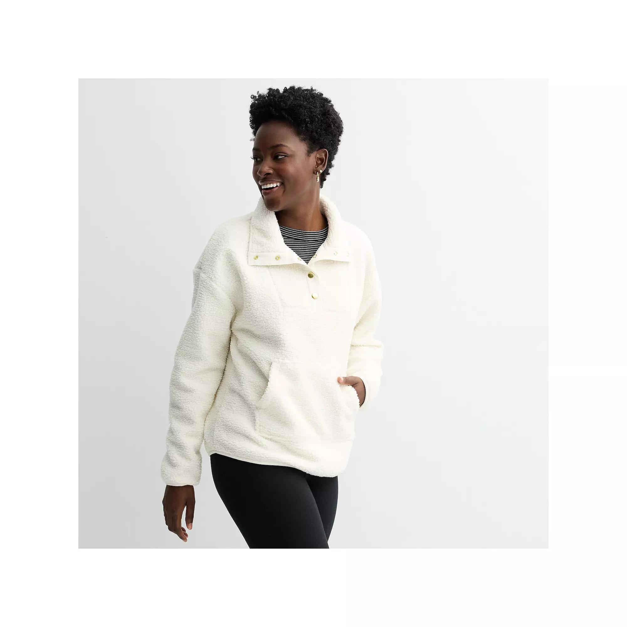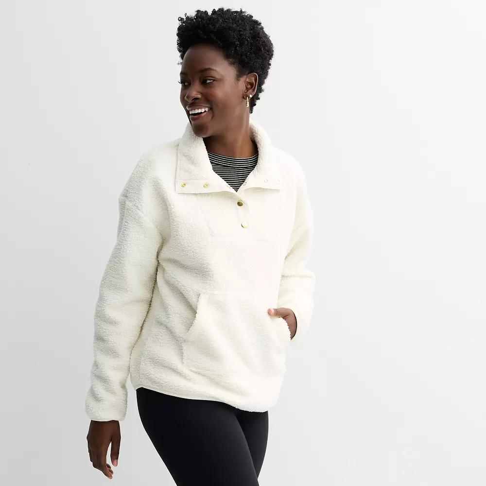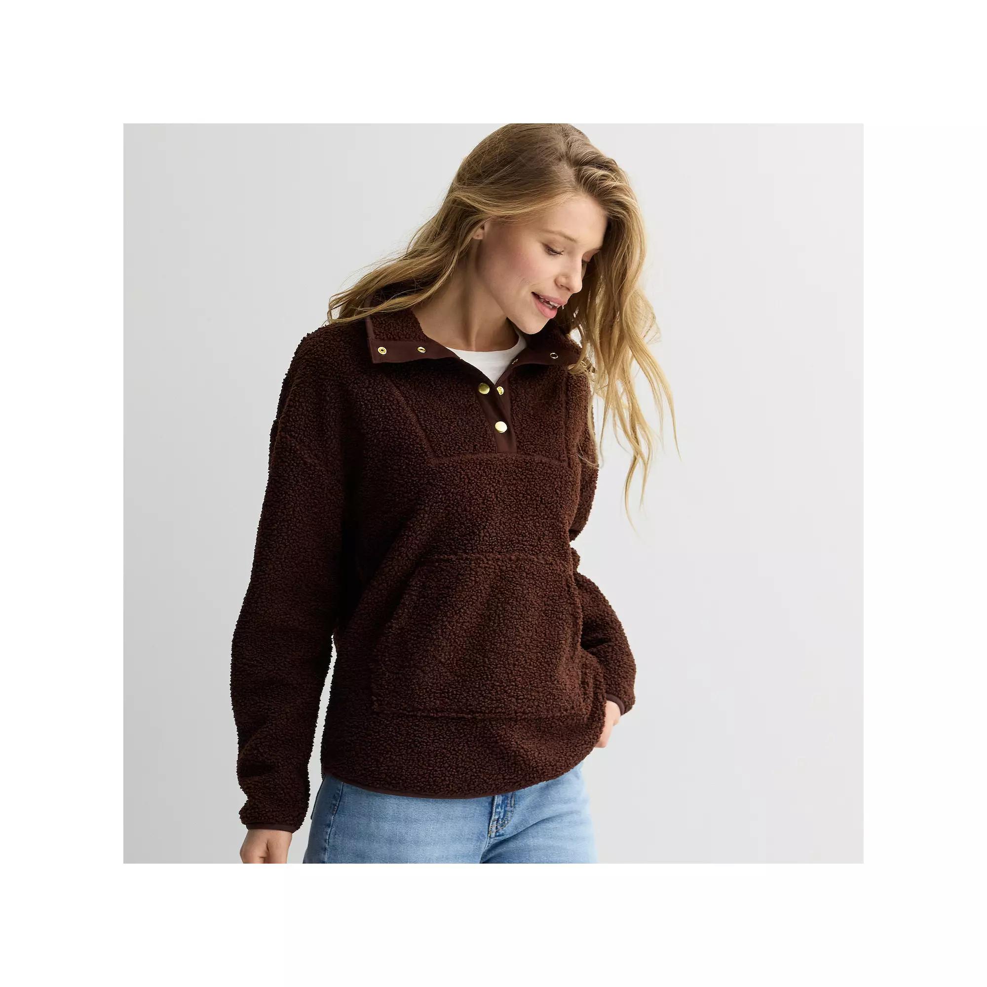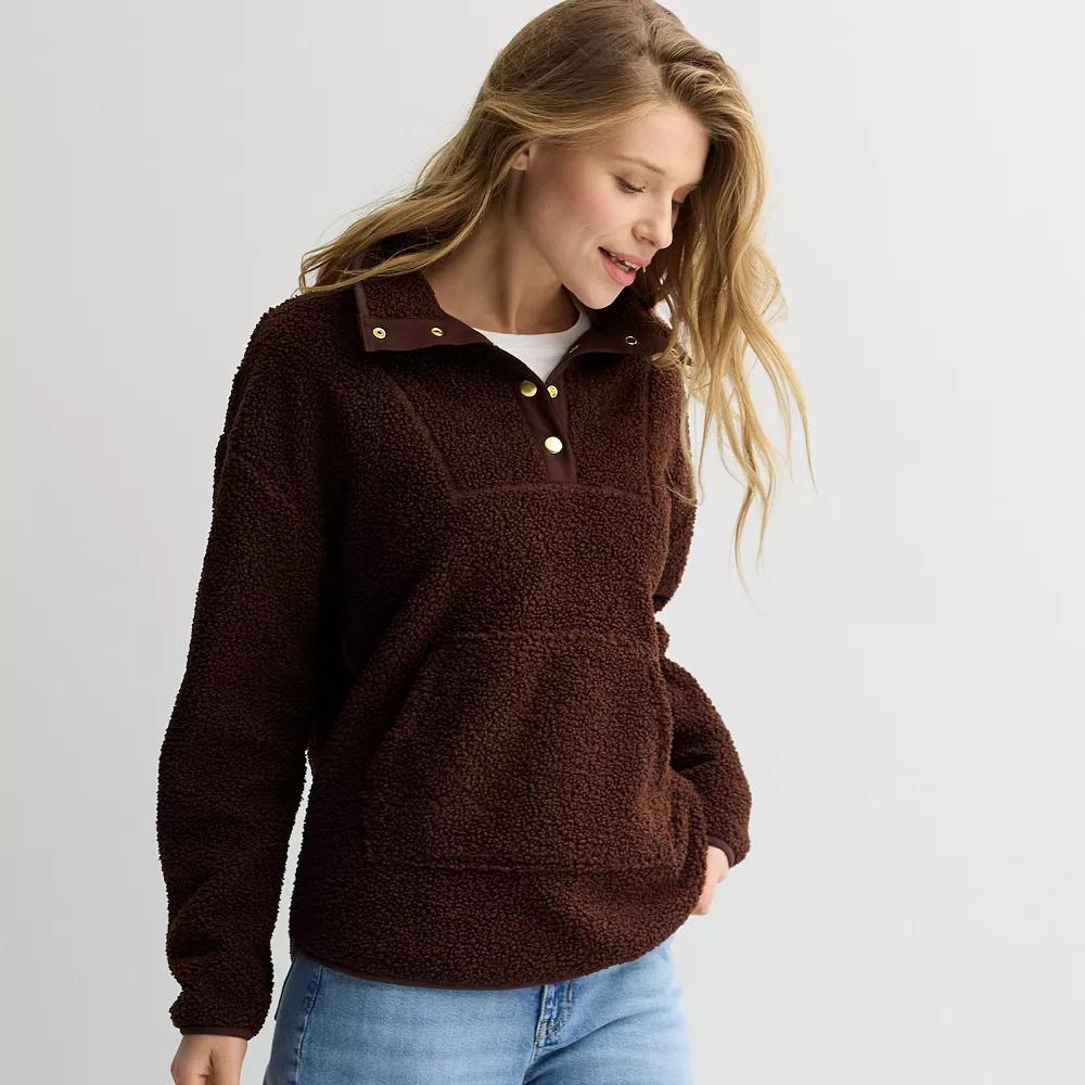Cozy up in this stylish pullover that features a unique bonded sherpa fabric, perfect for chilly days. The chic bib at the front neckline adds a touch of flair, making it an ideal choice for casual outings or lounging at home. Click on this WOMEN'S GUIDE to find the perfect fit and more! - https://www.kohls.com/feature/womens-fit-guide.jsp. FEATURES: Soft, cozy bonded sherpa fabric, Stylish bib detail at the front neckline. FIT & SIZE: Relaxed fit, 27 1/4-in. length from shoulder to hem, Rounded hem. DETAILS: Snap closure, Collared neckline, Long, set-in sleeves, Elastic cuffs, Kangaroo pocket at front, Imported. MATERIAL & CARE: Bonded sherpa construction, faux fur, Polyester, Machine wash and tumble dry low. RESPONSIBLE Tested for harmful substances, STANDARD 100 by OEKO-TEX® CERTIFIED, Certification No. SE020 171210, Testing Institute: Testex AG: Swiss Textile Testing Institute, www.oeko-tex.com/standard100 - https://www.oeko-tex.com/en/our-standards/oeko-tex-standard-100. Size: X Large. Color: Naveena Plum. Gender: female. Age Group: adult. Material: FLEECE.