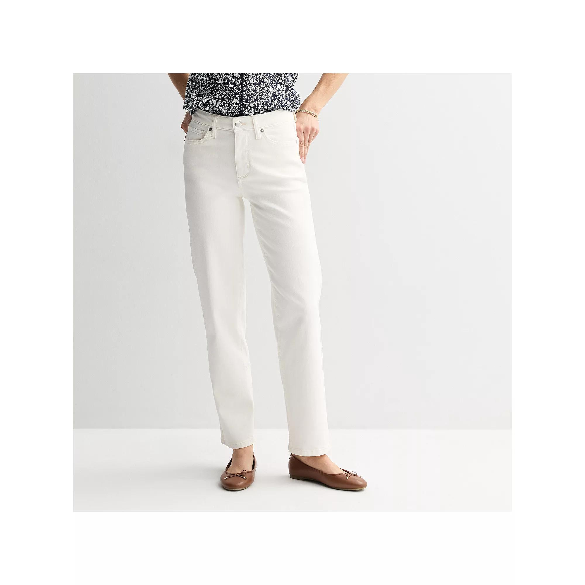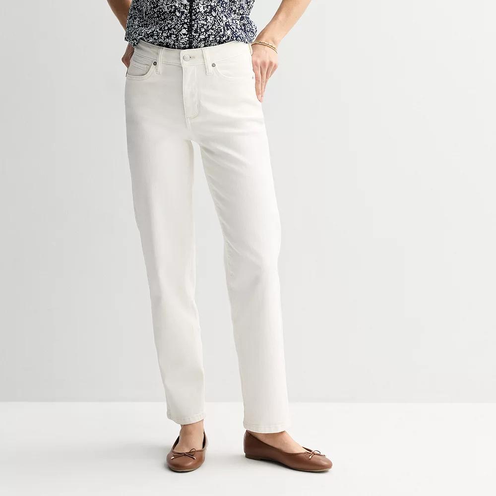 Perfect for any occasion, these high rise straight leg jeans by Sonoma Goods For Life are trendy and comfortable. Click on this WOMEN'S GUIDE to find the perfect fit and more! - https://www.kohls.com/feature/womens-fit-guide.jsp. FEATURES: Button & zipper closure, 2 front pockets, 2 back pockets, 1 coin pocket. FIT & SIZING: Contour waistband, High rise, sits below the natural waistline, Fitted through the hip and thigh, Short: 28 -in. inseam, Regular: 30-in. inseam. FABRIC & CARE: Cotton, polyester, elastane, Machine wash and tumble dry, Imported. RESPONSIBLE Supports more sustainable cotton farming, Tested for harmful substances, STANDARD 100 by OEKO-TEX® CERTIFIED, Certification No. 2021OK0365, Testing Institute: AITEX®, www.oeko-tex.com/standard100 - https://www.oeko-tex.com/en/our-standards/oeko-tex-standard-100. Size: 14 Regular. Color: White. Gender: female. Age Group: adult. Material: DENIM.