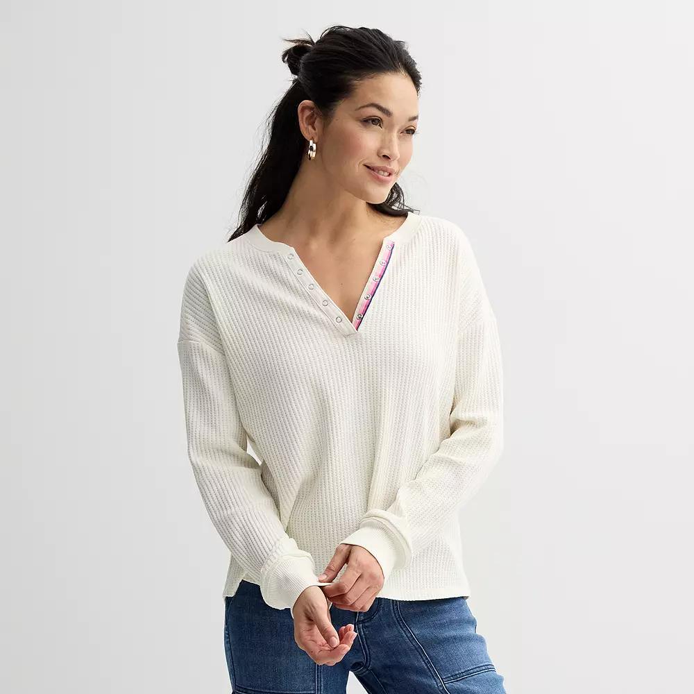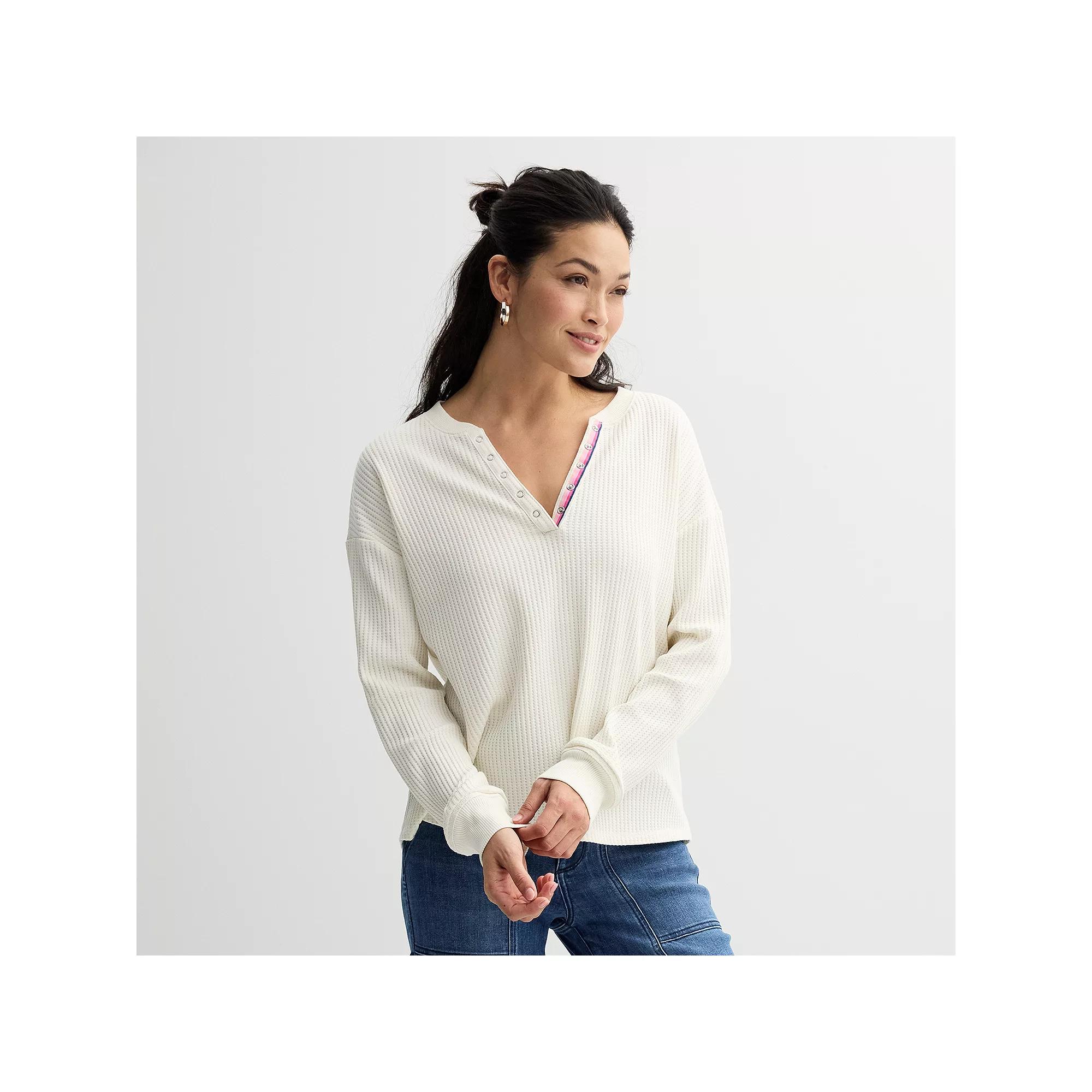 You'll love the charming and cozy style of this women's Relaxed Waffle Henley Top from Sonoma Goods For Life.Click on this WOMEN'S GUIDE to find the perfect fit and more!You'll love the charming and cozy style of this women's Relaxed Waffle Henley Top from Sonoma Goods For Life.Click on this WOMEN'S GUIDE to find the perfect fit and more!FEATURES Snap V-neck Long sleeves Ribbed cuffs Rounded hem Waffle constructionFIT & SIZING Regular fit 24 1/2-in. length from shoulder to hemFABRIC & CARE Cotton, modal, spandex Machine wash and tumble dry low ImportedRESPONSIBLE Supports more sustainable cotton farming Size: X Small. Color: Ivory Silk. Gender: female. Age Group: adult.