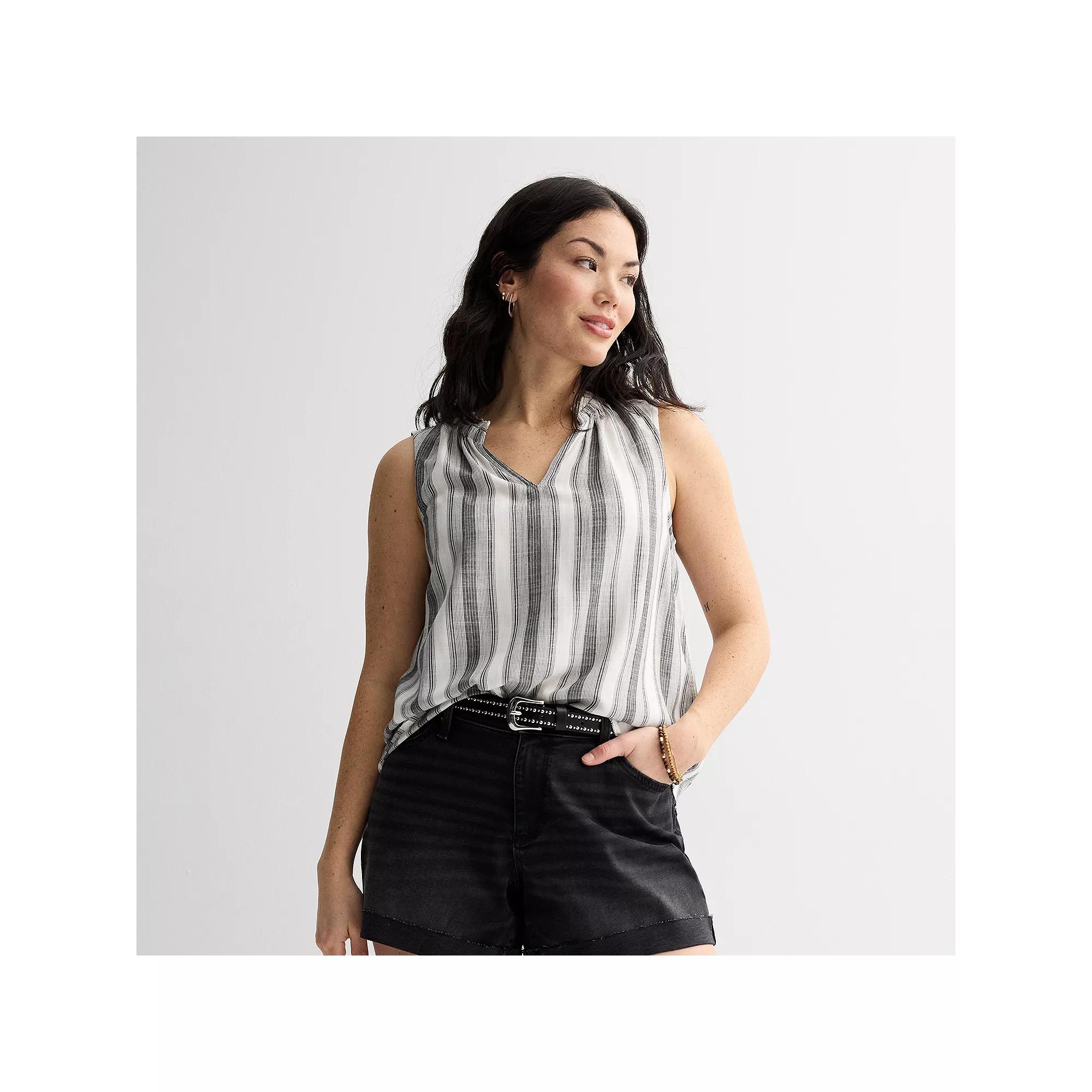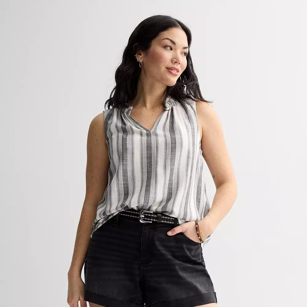 This women's Sonoma Goods For Life ruffle collar tank top is designed for effortless style and all-day comfort. Click on this WOMEN'S GUIDE to find the perfect fit and more!This women's Sonoma Goods For Life ruffle collar tank top is designed for effortless style and all-day comfort. Click on this WOMEN'S GUIDE to find the perfect fit and more!FEATURES V-neck Sleeveless Straight hem Pullover styling Soft-hand feel constructionFIT & SIZING Regular fit 25-in. length from shoulder to hemFABRIC & CARE Rayon Machine wash Imported Size: Large. Color: Black Beige Stripe. Gender: female. Age Group: adult.