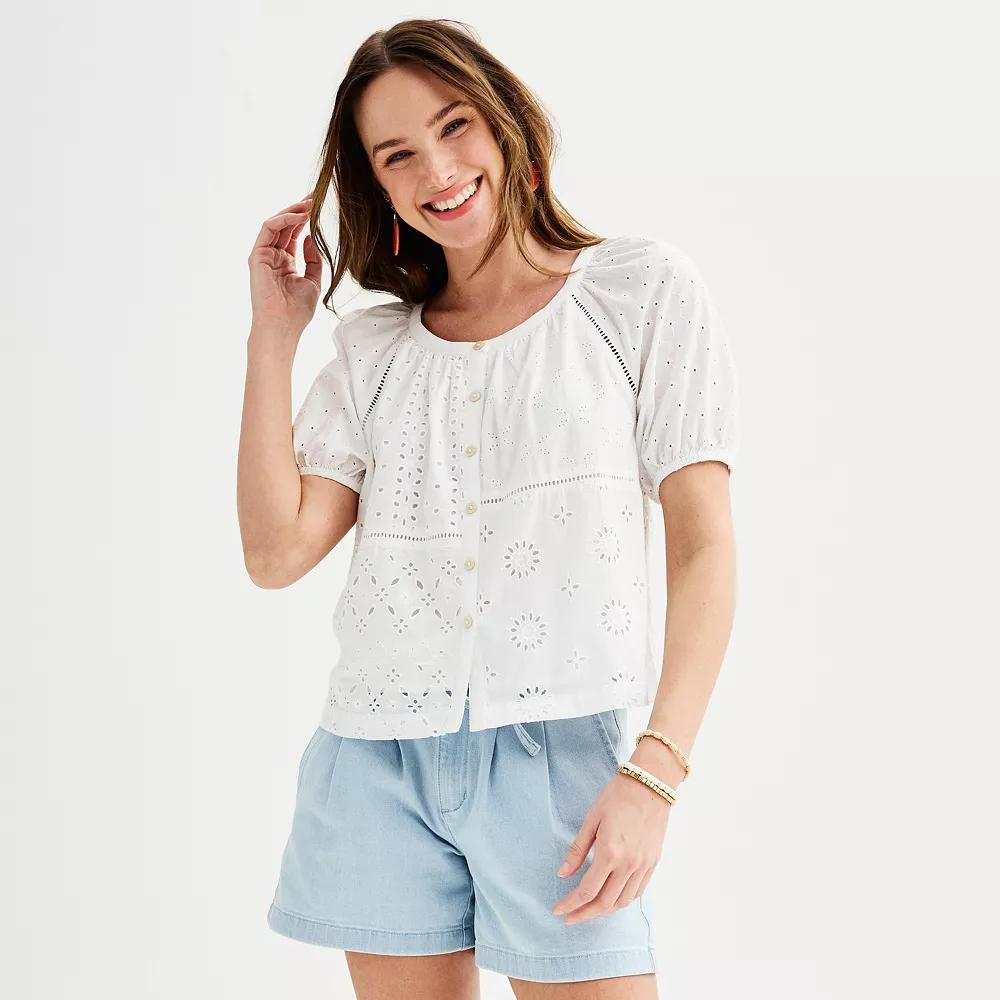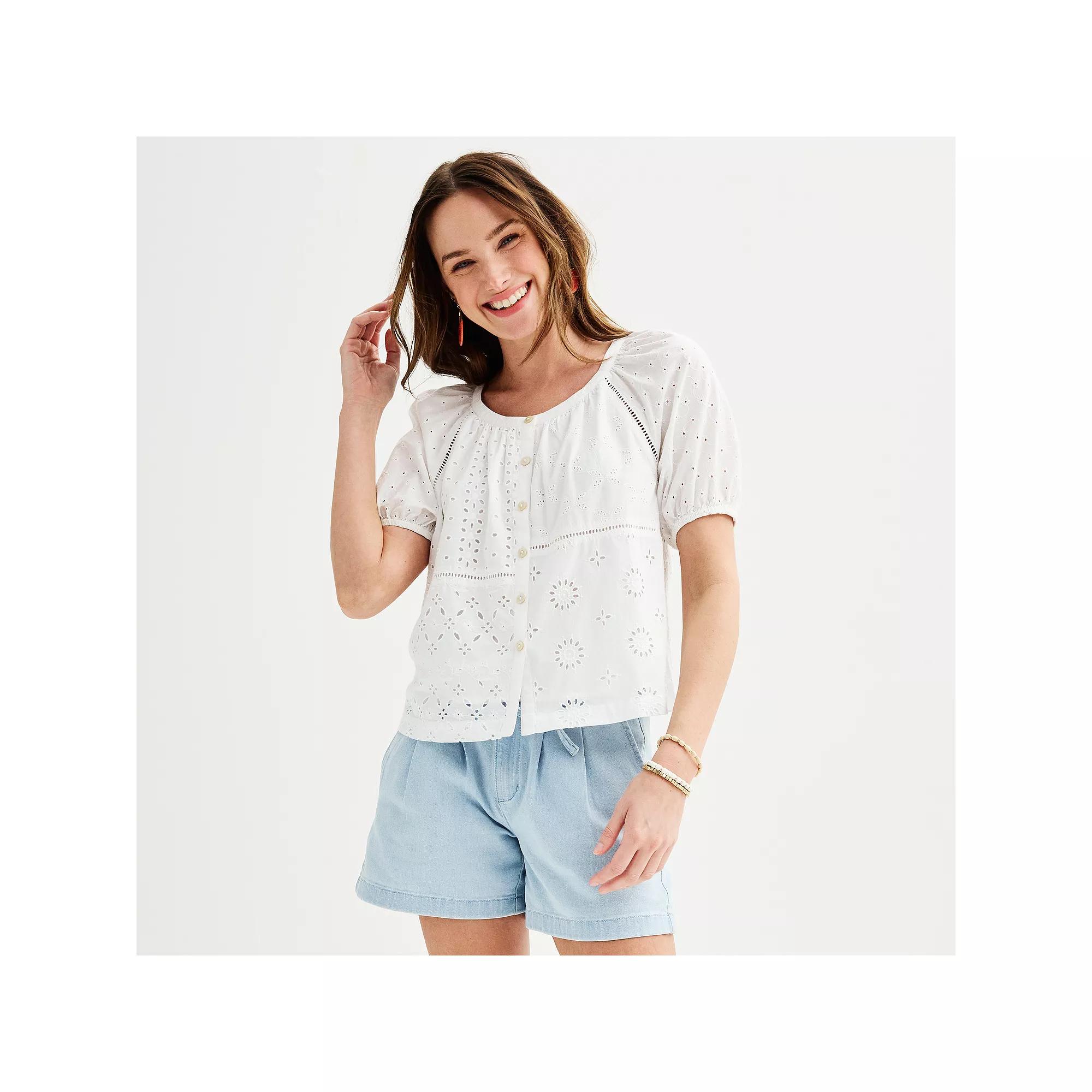 This cute Womens Sonoma Goods For Life Short Puff Sleeve Eyelet Detailed Button Down Top is the perfect pick to complete your next warm weather outfit ensemble.Click on this WOMENS GUIDE to find the perfect fit and more! This cute Womens Sonoma Goods For Life Short Puff Sleeve Eyelet Detailed Button Down Top is the perfect pick to complete your next warm weather outfit ensemble.Click on this WOMENS GUIDE to find the perfect fit and more! FEATURES Crewneck Button front closure Short puffed sleeves Elastic cuffs Fully lined Straight hemFIT & SIZING 22 1/4-in. length from shoulder to hemFABRIC & CARE Cotton Lining: cotton Eyelet construction Machine wash ImportedRESPONSIBLE Supports more sustainable cotton farming Size: Large. Color: White. Gender: female. Age Group: adult.