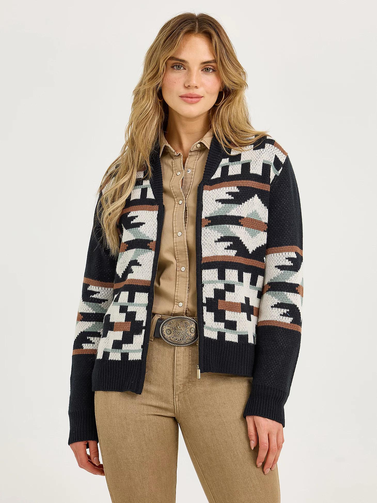 Shop the Women's Southwestern Full Zip Cardigan Sweater on Wrangler.com, the official website for Wrangler TOPS and all your favorite Wrangler women's apparel.