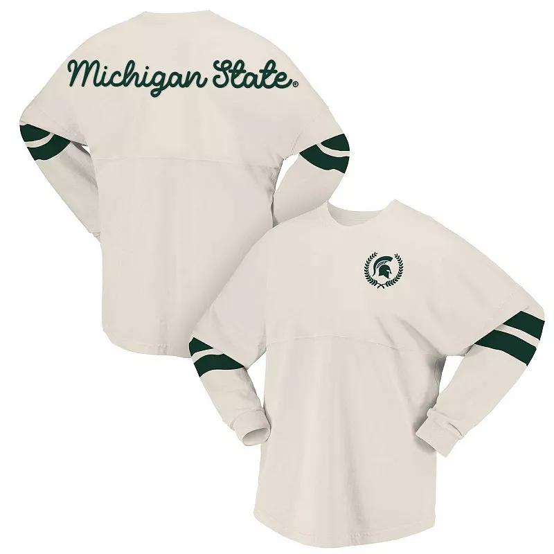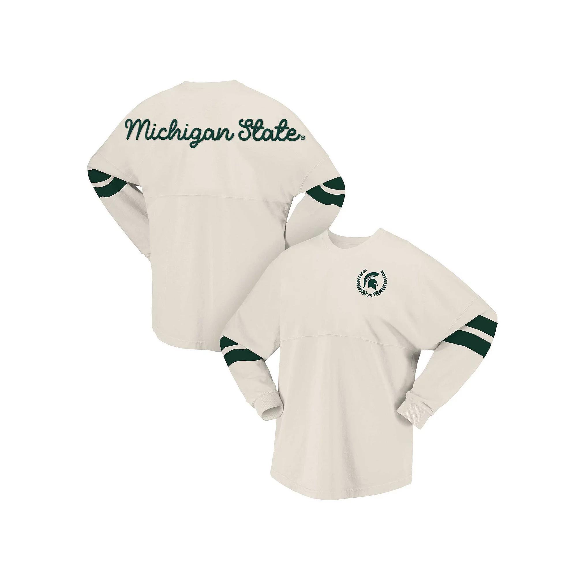 Stay at the top of your fashion game in this Michigan State Spartans Oversized T-shirt. Designed by Spirit Jersey, it features the official Michigan State Spartans logo printed on the front and the team name in low-puff details across the back. A roomy fit and dropped shoulders create a chic look thats comfortable to wear all day.Stay at the top of your fashion game in this Michigan State Spartans Oversized T-shirt. Designed by Spirit Jersey, it features the official Michigan State Spartans logo printed on the front and the team name in low-puff details across the back. A roomy fit and dropped shoulders create a chic look thats comfortable to wear all day.PRODUCT FEATURESCrew neckBrand: Spirit JerseyDouble needle coverstitch yokeLong sleeveRounded hemLow-puff screen print graphicsHeavy pre-shrunk jersey fabricMachine wash with garment inside out, tumble dry lowOfficially licensedMaterial: 100% CottonDropped shouldersOversized fit (recommend sizing down one for a standard fit)Imported Size: XL. Color: Beige. Gender: female. Age Group: adult.