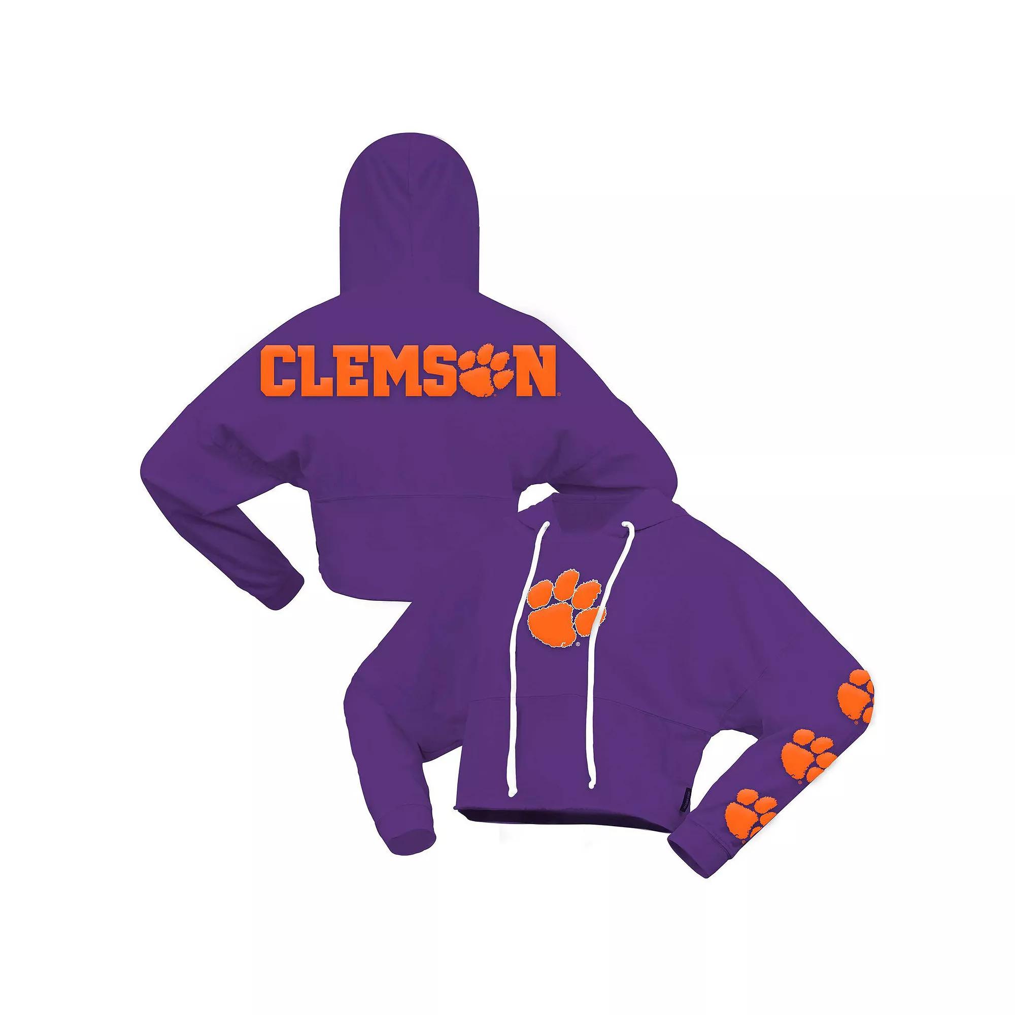 Stay at the top of your fashion game in this Clemson Tigers cropped pullover hoodie. Its oversized design by Spirit Jersey features the Clemson Tigers logo printed on the front and left sleeve with the team name in low-puff details across the back. A roomy fit and dropped shoulders create a chic look thats comfortable to wear all day.Stay at the top of your fashion game in this Clemson Tigers cropped pullover hoodie. Its oversized design by Spirit Jersey features the Clemson Tigers logo printed on the front and left sleeve with the team name in low-puff details across the back. A roomy fit and dropped shoulders create a chic look thats comfortable to wear all day.PRODUCT FEATURESLow-puff screen print graphicsDropped shouldersLong sleevePulloverOfficially licensedMachine wash with garment inside out, tumble dry lowCropped rounded hemMidweight hoodie suitable for moderate temperaturesHoodedDouble needle coverstitch yokeMaterial: 100% CottonImportedOversized fit (recommend sizing down one for a standard fit)Heavy pre-shrunk jersey fabricBrand: Spirit Jersey Color: Purple. Gender: female. Age Group: adult.