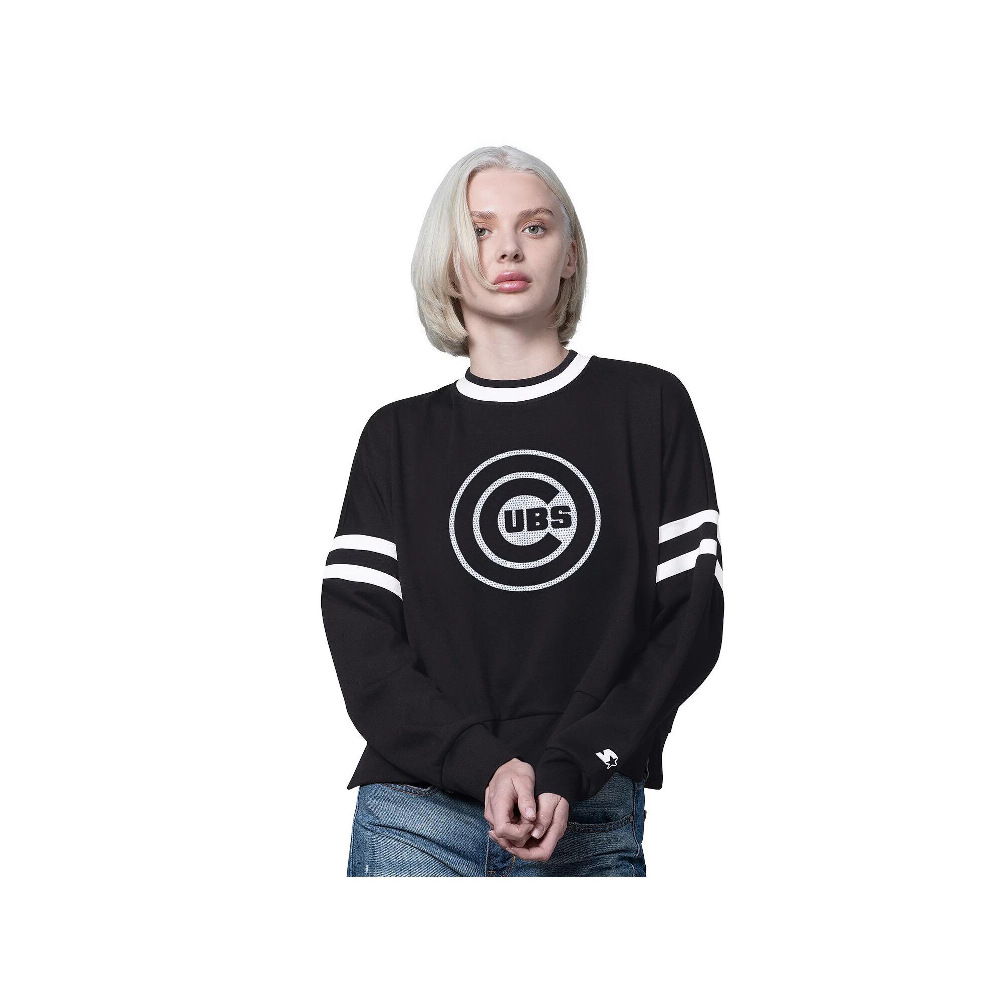 Rep your team in style with this Chicago Cubs Rally Cropped Drop Shoulder Crewneck Sweatshirt from Starter. The cropped hem adds a stylish and modern aesthetic, perfect for showing off your Chicago Cubs pride in a trendy way. The oversized fit and dropped shoulder seams provide effortless mobility, allowing you to cheer comfortably from the couch or the stands. Imported. Crew neck. Brand: Starter. Cropped hem adds a stylish and modern aesthetic. Side splits. Oversized Fit: Intentionally designed with larger proportions for a spacious, laidback look. Long sleeve. Contrast-color collar. Midweight sweatshirt suitable for moderate temperatures. Dropped shoulder seams for effortless mobility. Material: 60% Cotton/40% Polyester - Body; 96% Polyester/4% Spandex - Trim. Rib-knit collar and cuffs for a snug fit and durable stretch. Officially licensed. Pullover. Team logo sequenced on front. Machine wash, tumble dry low. Size: XS. Color: Black. Gender: female. Age Group: adult.
