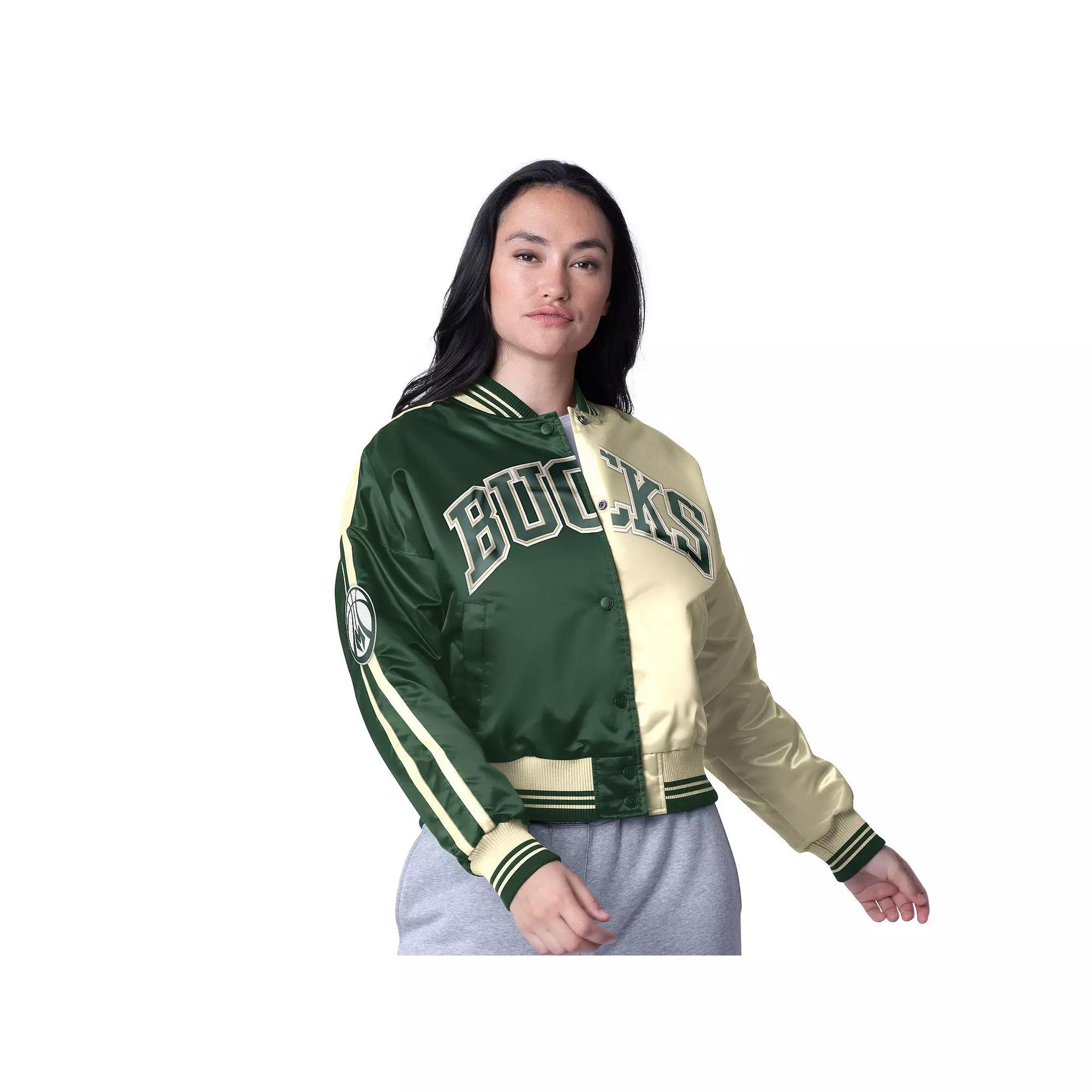 Make a statement in this Milwaukee Bucks Zone Blitz Cropped Full-Snap Satin Jacket from Starter. This satin jacket features a quilted lining for extra warmth and a cropped hem for a stylish touch. With twill applique team graphics across the chest and back, everyone will know you're repping the Milwaukee Bucks.Make a statement in this Milwaukee Bucks Zone Blitz Cropped Full-Snap Satin Jacket from Starter. This satin jacket features a quilted lining for extra warmth and a cropped hem for a stylish touch. With twill applique team graphics across the chest and back, everyone will know you're repping the Milwaukee Bucks.PRODUCT FEATURESMaterial: 100% PolyesterImportedCropped hem adds a stylish and modern aestheticBrand: StarterTwill applique team graphics across chest and backLong sleeveMachine wash, tumble dry lowOfficially licensedStriped rib-knit cuffs, stand-up collar and hem for a secure fitMidweight jacket suitable for moderate temperaturesQuilted lining for extra warmthFull SnapDropped shoulders provide a relaxed fit Color: Beige. Gender: female. Age Group: adult.