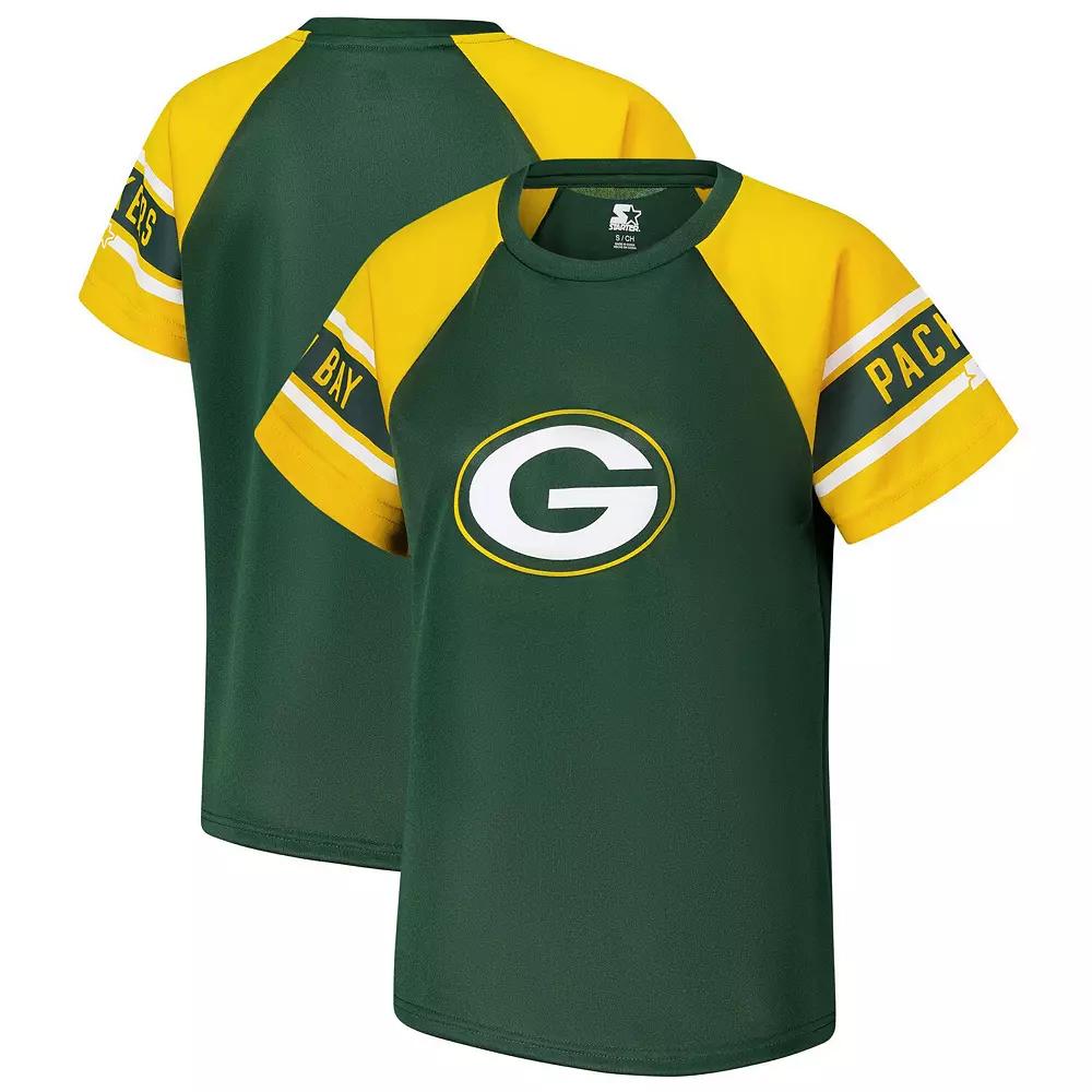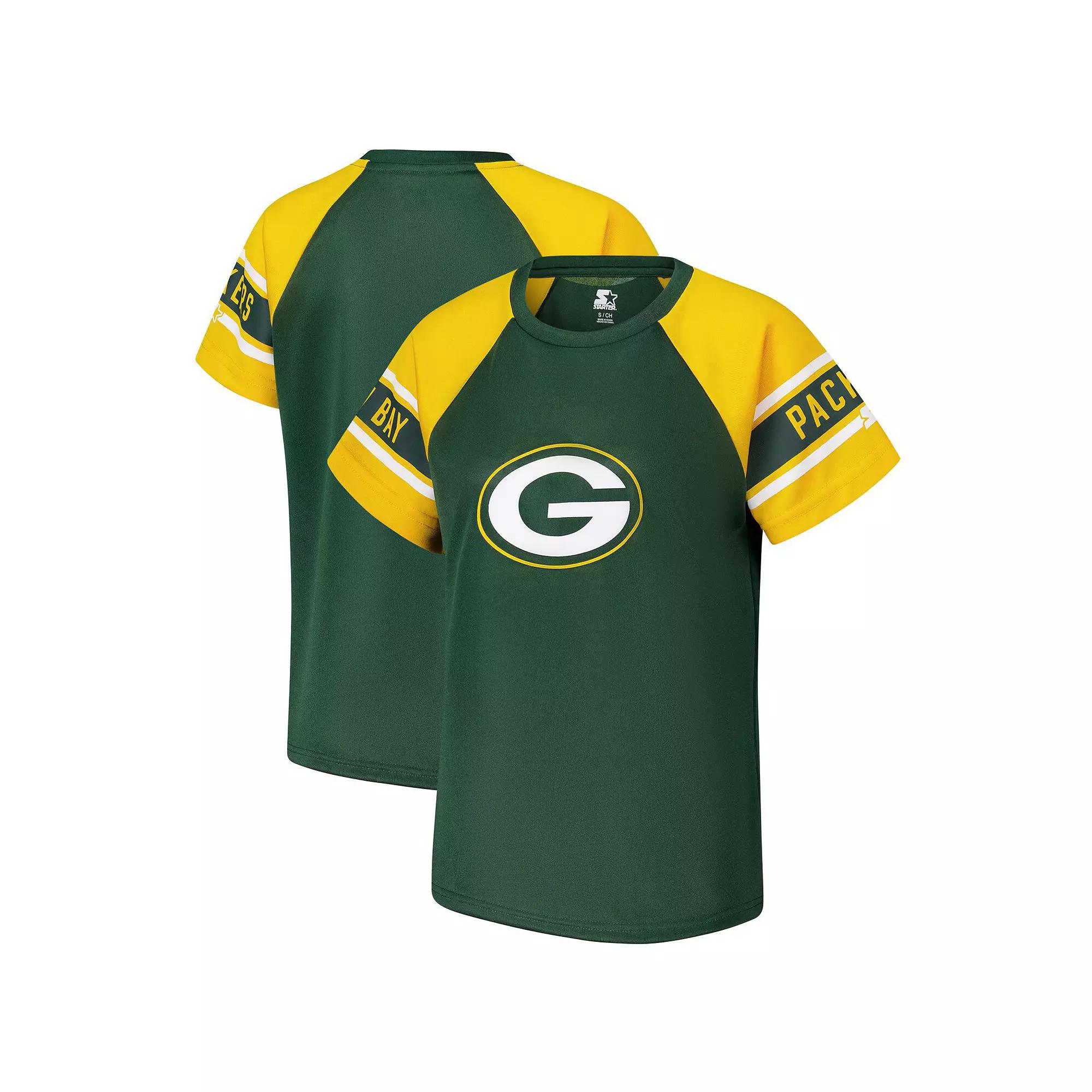 Sport a classic look with this Green Bay Packers 1st Rounder Color Block Raglan Top from Starter. This trendy top boasts a color block design with raglan sleeves for a sporty and stylish look thats ready to move with you. The printed oversize logo on the front chest and team details on the sleeves proudly display your Green Bay Packers fandom. This slim-fit top is crafted from breathable polyester, ensuring you stay cool and comfortable all day long.Sport a classic look with this Green Bay Packers 1st Rounder Color Block Raglan Top from Starter. This trendy top boasts a color block design with raglan sleeves for a sporty and stylish look thats ready to move with you. The printed oversize logo on the front chest and team details on the sleeves proudly display your Green Bay Packers fandom. This slim-fit top is crafted from breathable polyester, ensuring you stay cool and comfortable all day long.PRODUCT FEATURESShort sleeveMachine wash with garment inside out, tumble dry lowImportedMaterial: 100% PolyesterPrinted oversize logo on front chestBrand: StarterSlim fit top provides a sleek and tailored silhouetteTeam and city name with stripes on sleevesOfficially licensedCrew neckRaglan sleeves for greater freedom of movement in the shoulders and arms Gender: female. Age Group: adult. Material: Cotton.