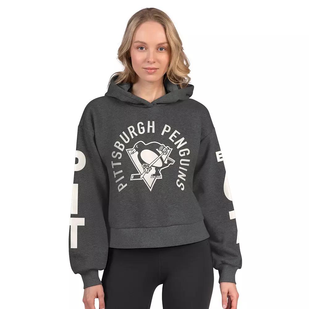 Rep your Pittsburgh Penguins squad in style with this Pittsburgh Penguins Star Player Fleece Hoodie from Starter. The cropped length offers a modern silhouette that's perfect for pairing with your favorite high-waisted jeans or leggings. The team logo and wordmarks printed on the front and sleeves boldly display your Pittsburgh Penguins pride, making this a standout piece for game day or everyday wear. Team wordmarks printed down sleeves. Midweight pullover suitable for moderate temperatures. Material: 60% Cotton/40% Polyester. Brand: Starter. Rib-knit cuffs and hem for durable stretch and a snug fit. Long sleeve. Imported. Relaxed Fit: Loose and roomy across the chest, shoulders and body. Officially licensed. Fleece lining provides added warmth and a soft feel. Cropped length (Measures approx. 19.5). Team logo graphic design printed on front. Hooded. Pullover. Machine wash, tumble dry low. Color: Charco. Gender: female. Age Group: adult.