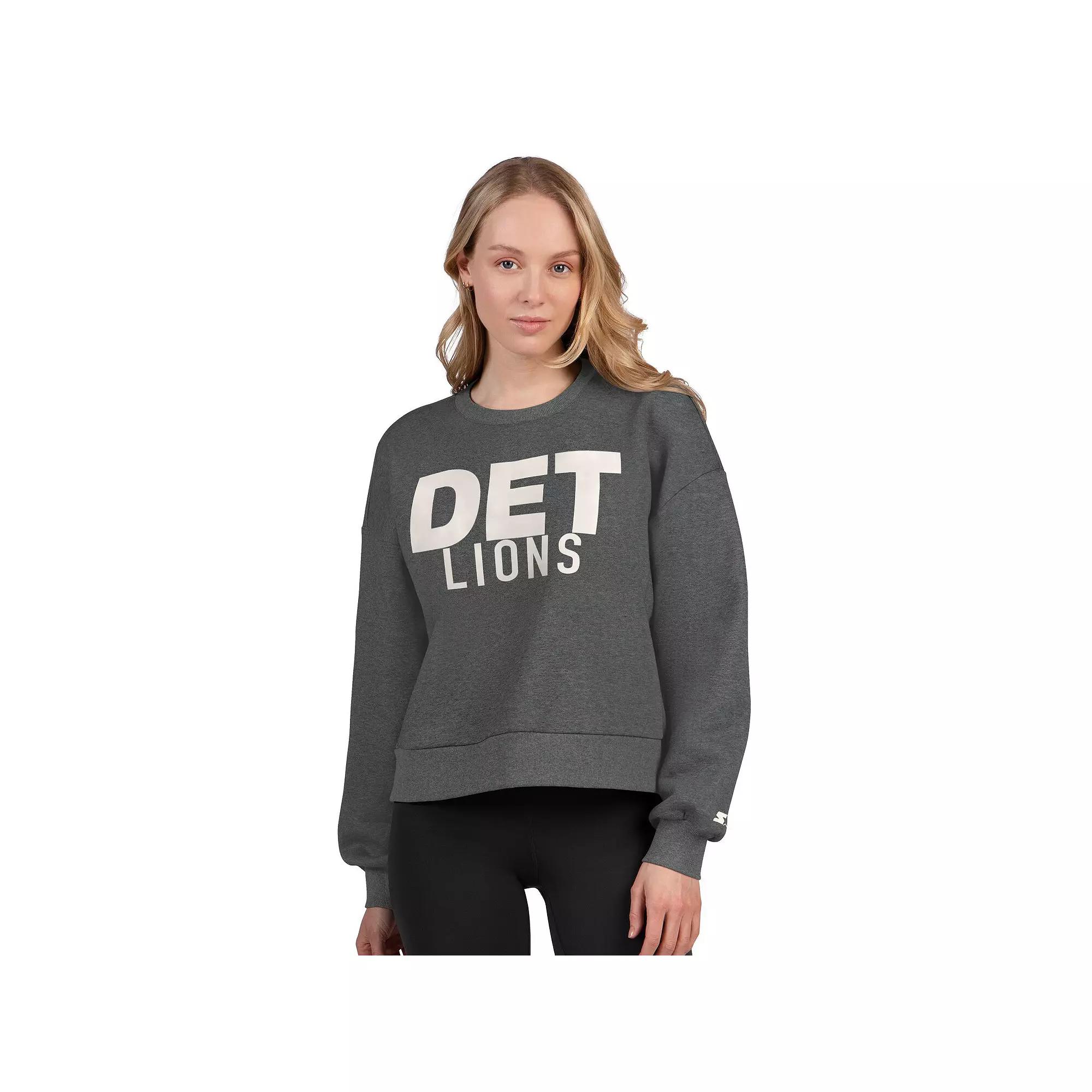 Rep your NFL squad in trendy, vintage-inspired fashion with this Detroit Lions Show Up Cropped Fleece Pullover Sweatshirt from Starter. The cropped design and rib-knit cuffs add a modern twist to your Detroit Lions fandom, bringing elevated comfort to any outfit. The soft fleece lining ensures a cozy feel, perfect for those chilly game days or casual outings. Brand: Starter. Crew neck. Rib-knit cuffs, collar, and hem for durable stretch and a snug fit. Imported. Machine wash, tumble dry low. Cropped length (Measures approx. 20). Fleece lining for additional warmth. Team name and city abbreviation printed on front. Midweight pullover suitable for moderate temperatures. Pullover. Material: 60% Cotton/40% Polyester. Printed small team logo on upper back. Long sleeve. Officially licensed. Color: Grey. Gender: female. Age Group: adult.
